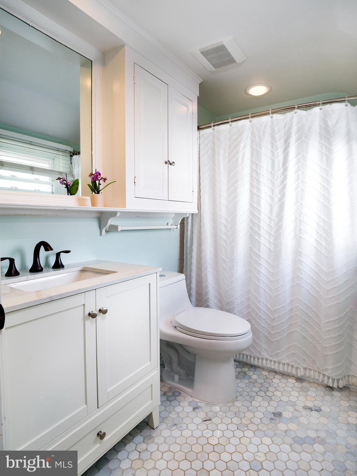 Up the stairs to the Second Floor, where a large primary Bedroom awaits with a private primary Bathroom, two more nice-sized bedrooms, filled abundance of natural light and a Ceramic Tile Hall Bathroom with Quartz Countertops and marble floor.