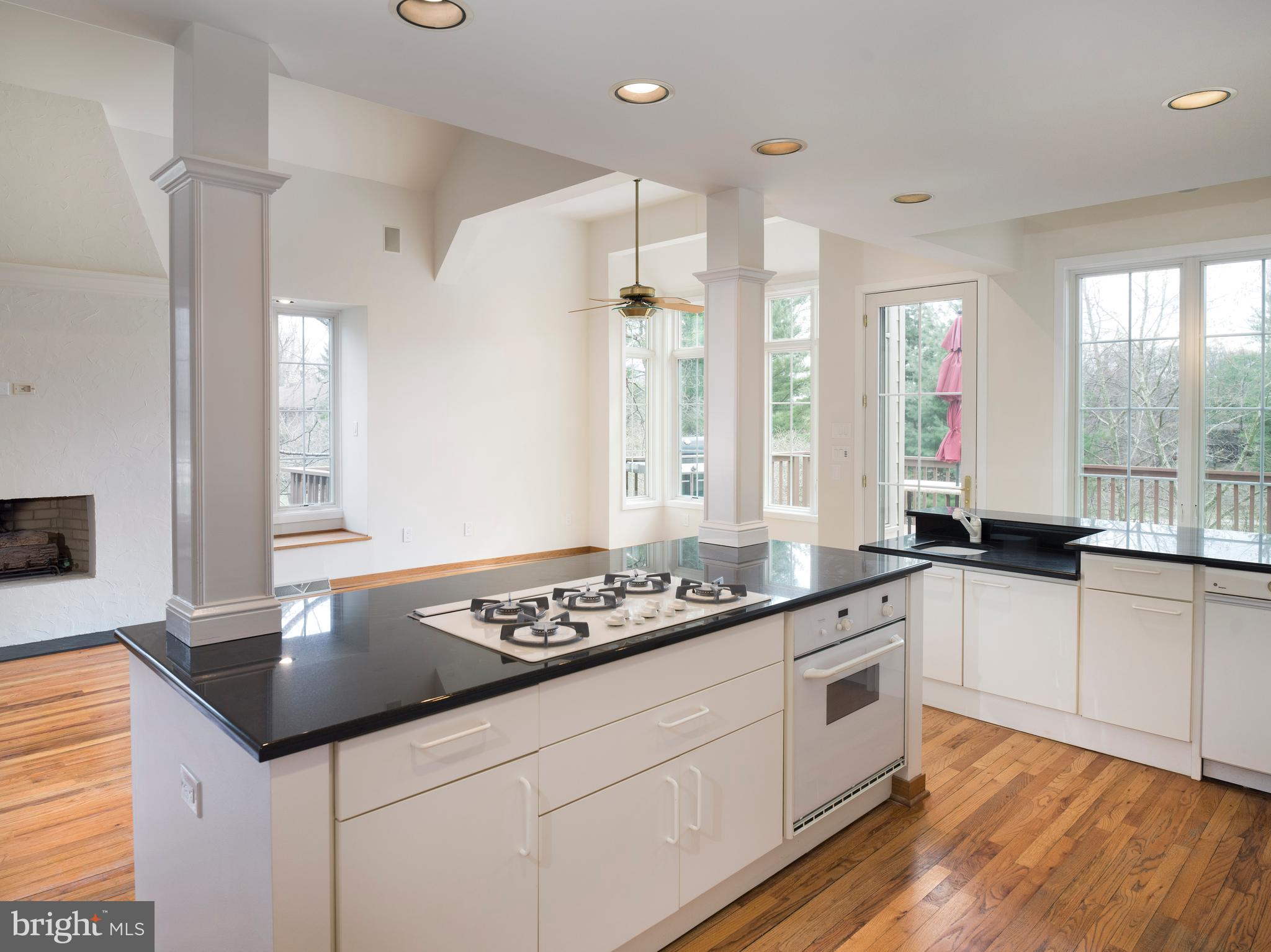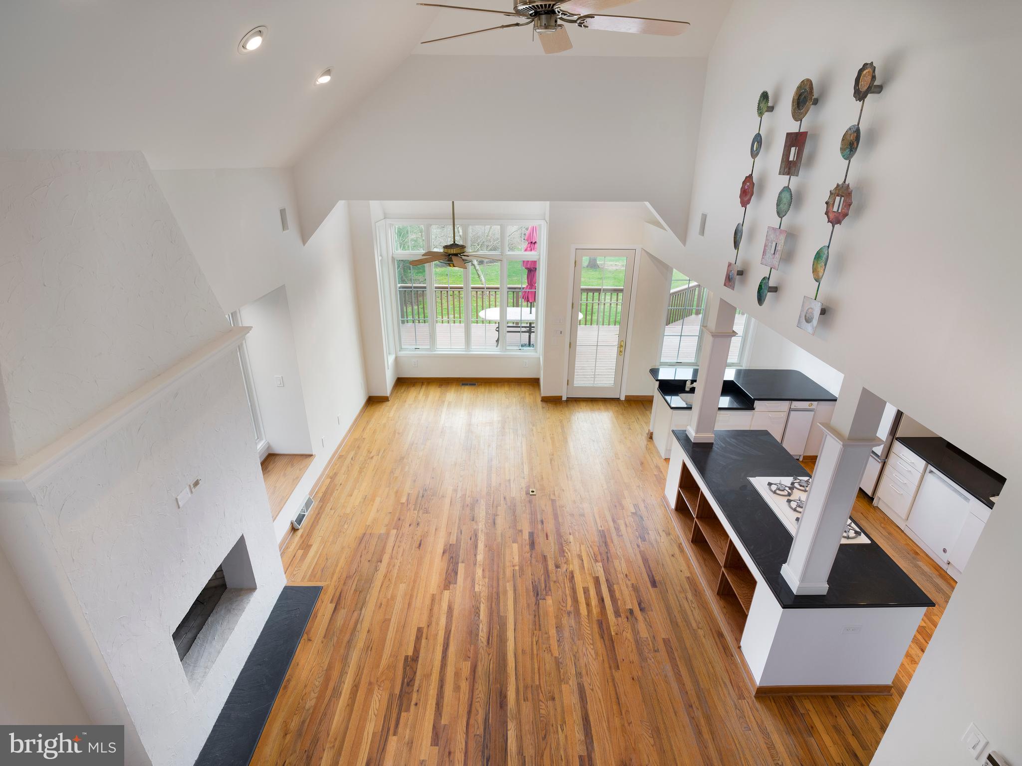 Enjoy breathtaking views from multiple rooms and the expansive deck, accessible from both the open-plan kitchen/breakfast/great room area and the formal dining room. Enter through a grand two-story foyer that leads to a formal dining room with stunning hardwood floors and deck access. The bright and spacious living room to the right features a fireplace, hardwood flooring, and large windows.