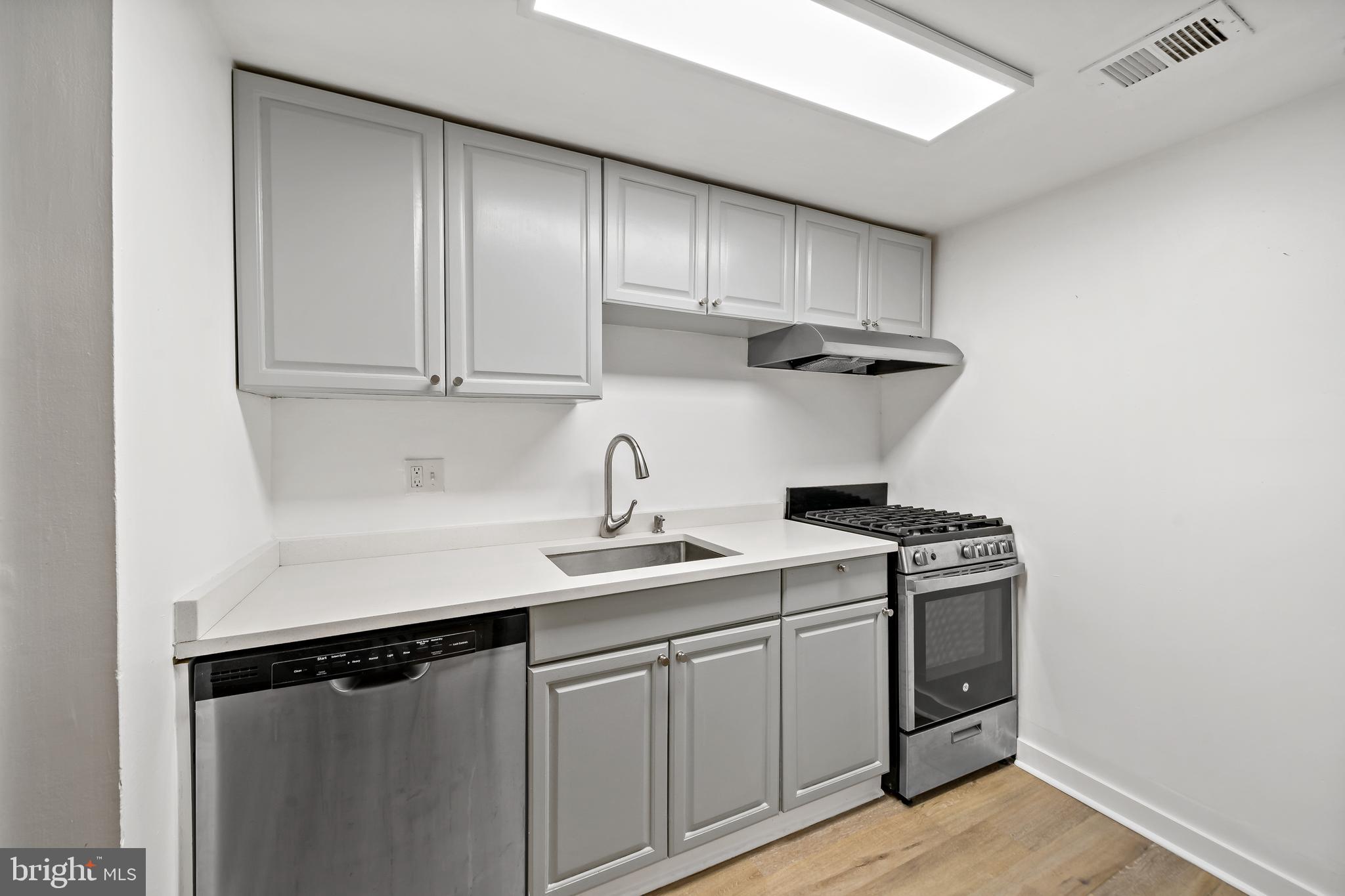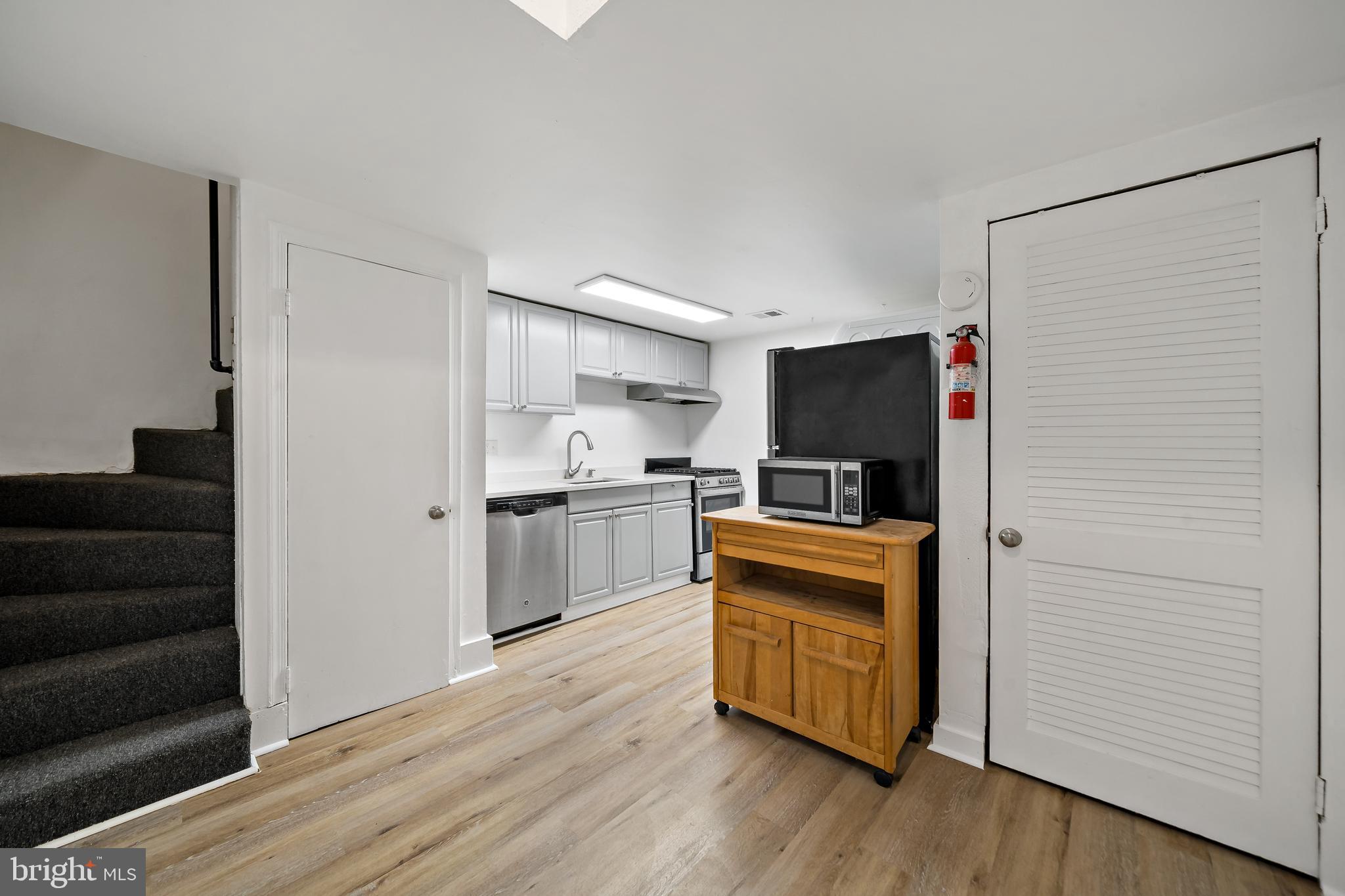 The front door is situated inside a private gated courtyard. As you step inside the home you'll be greeted by a cozy, inviting living space with beautiful hardwood floors and a large bay window well that welcomes natural light into the space. Downstairs you will find the well-appointed kitchen which offers modern appliances and ample space to both cook and dine.