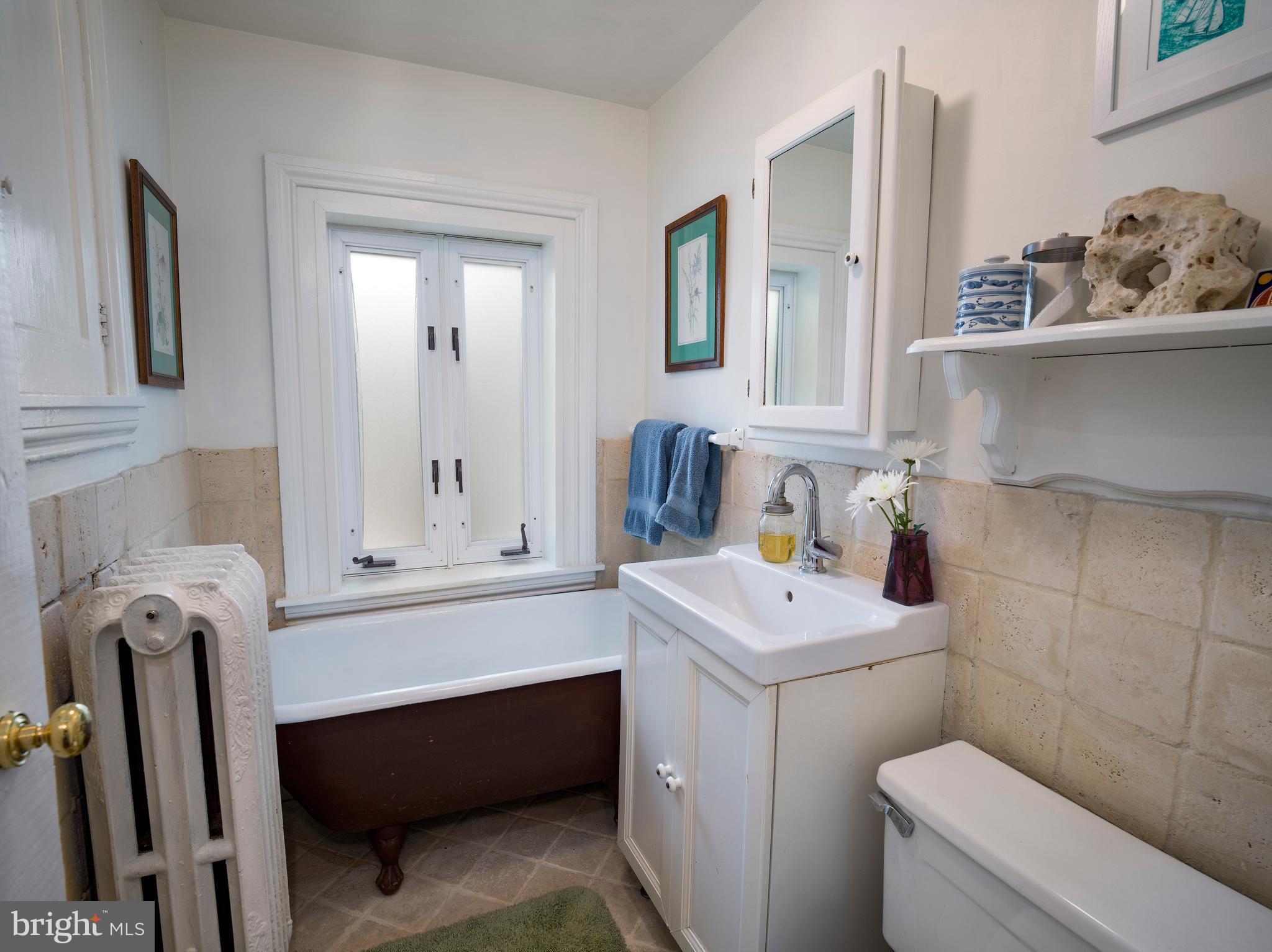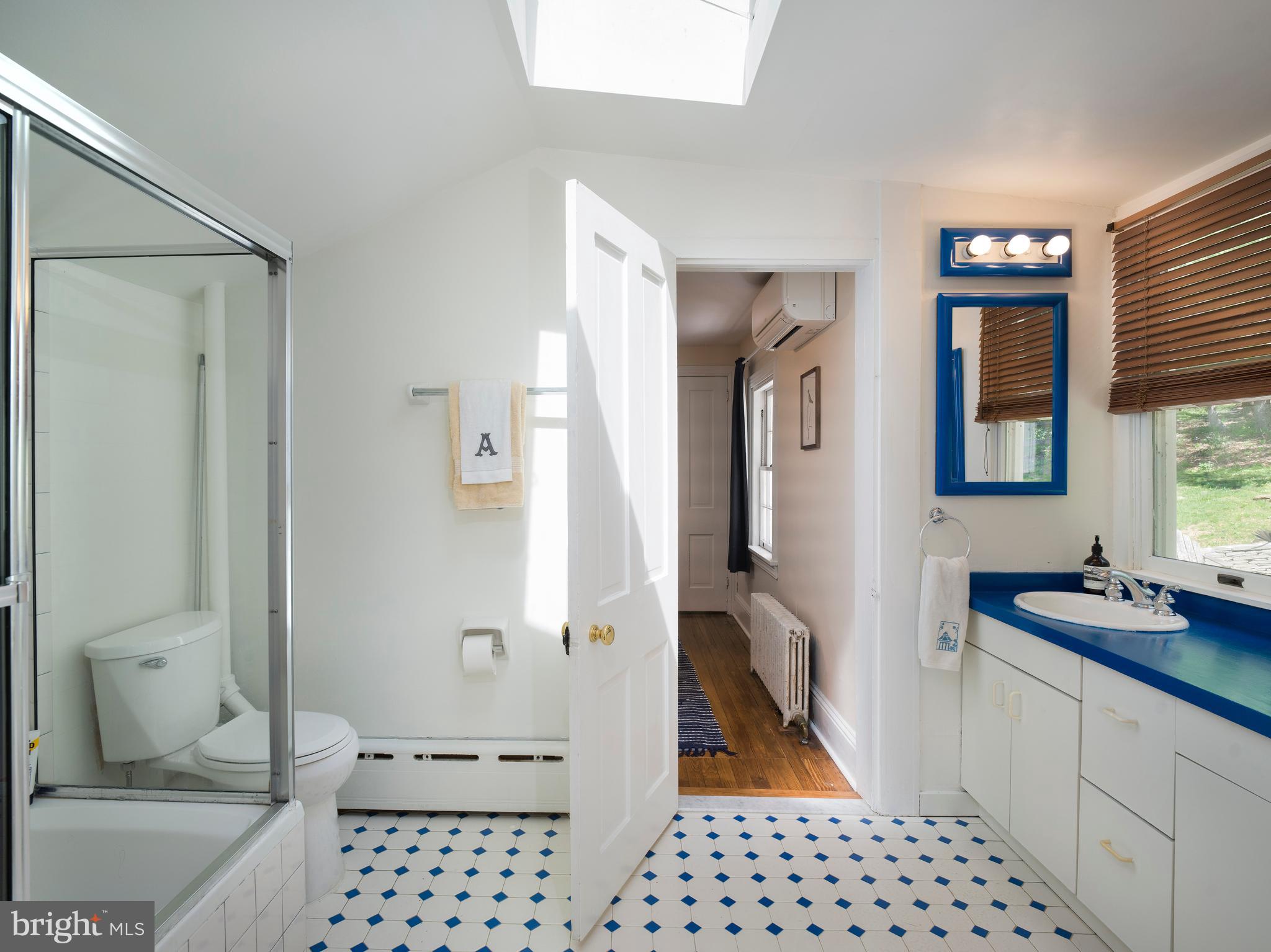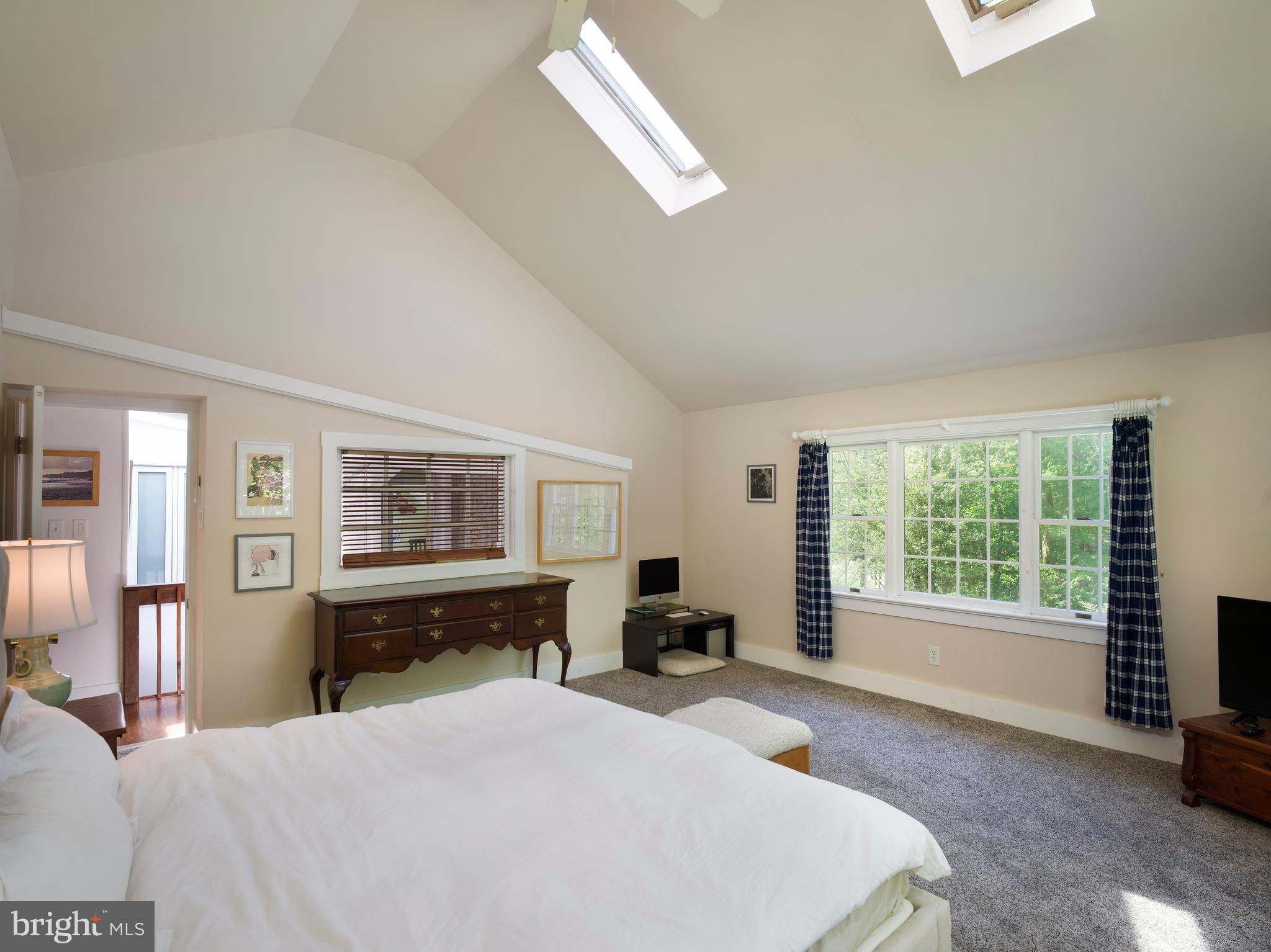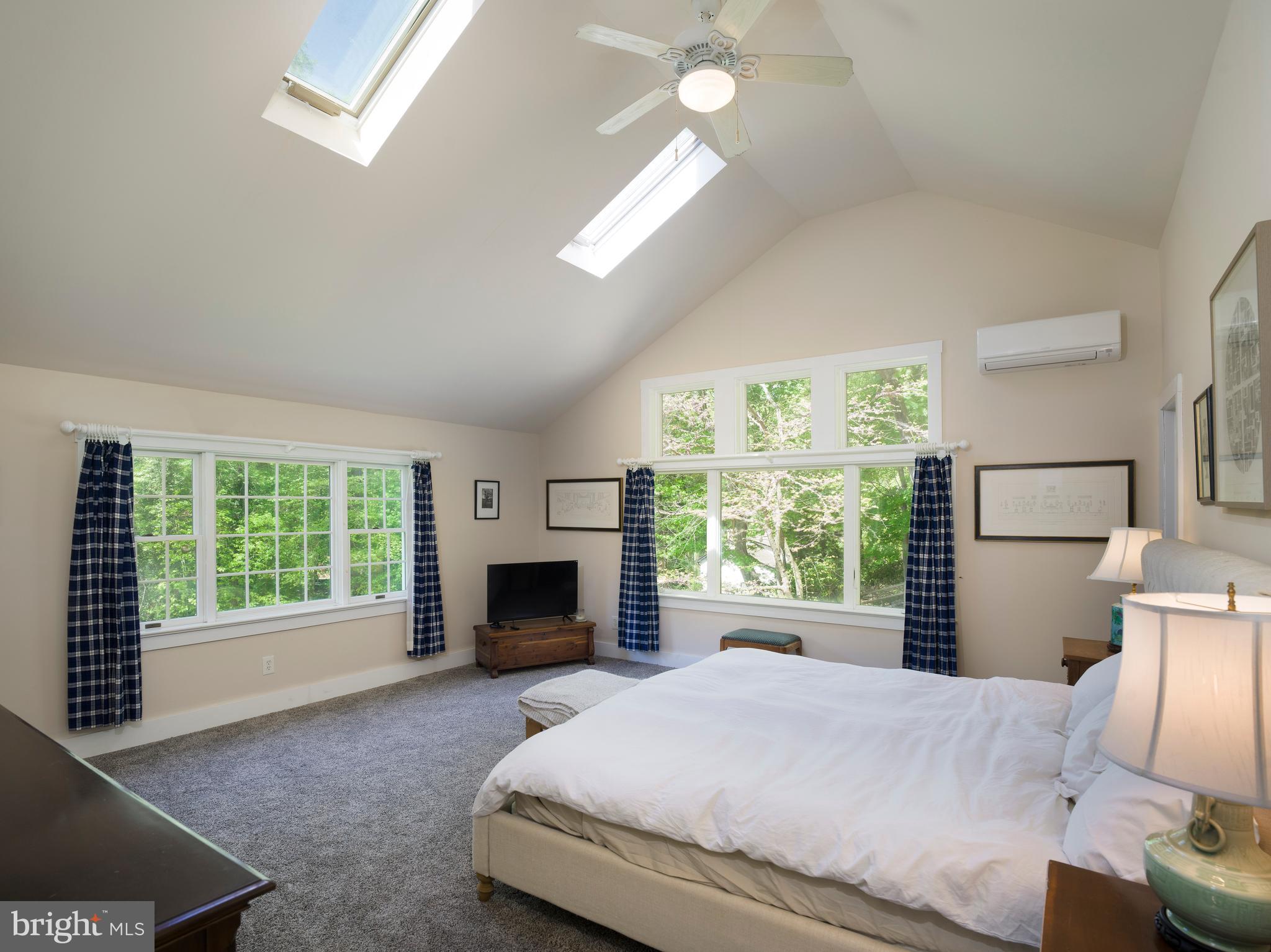 Upstairs, five bedrooms and three full baths provide flexibility and comfort. The vaulted primary suite feels like a peaceful retreat, with two full walls of windows, skylights, and tranquil views of the lush grounds. A large walk-in closet and modern en-suite bath complete the space. Two additional bedrooms share a cheerful Jack-and-Jill bath, and a fourth bedroom and fifth bedroom --classic and cozy--are served by a hall bath with a claw-foot tub and vintage charm.
