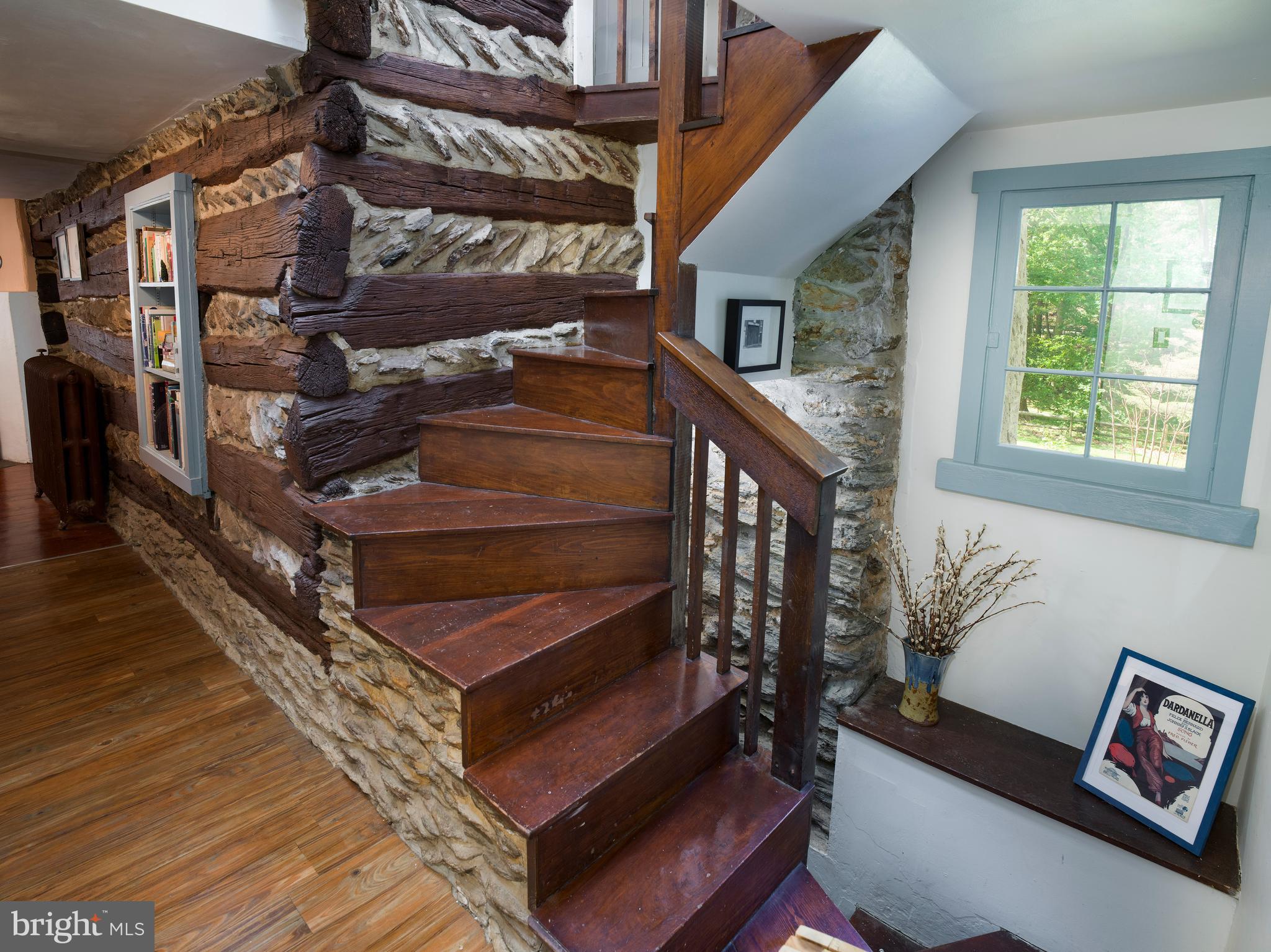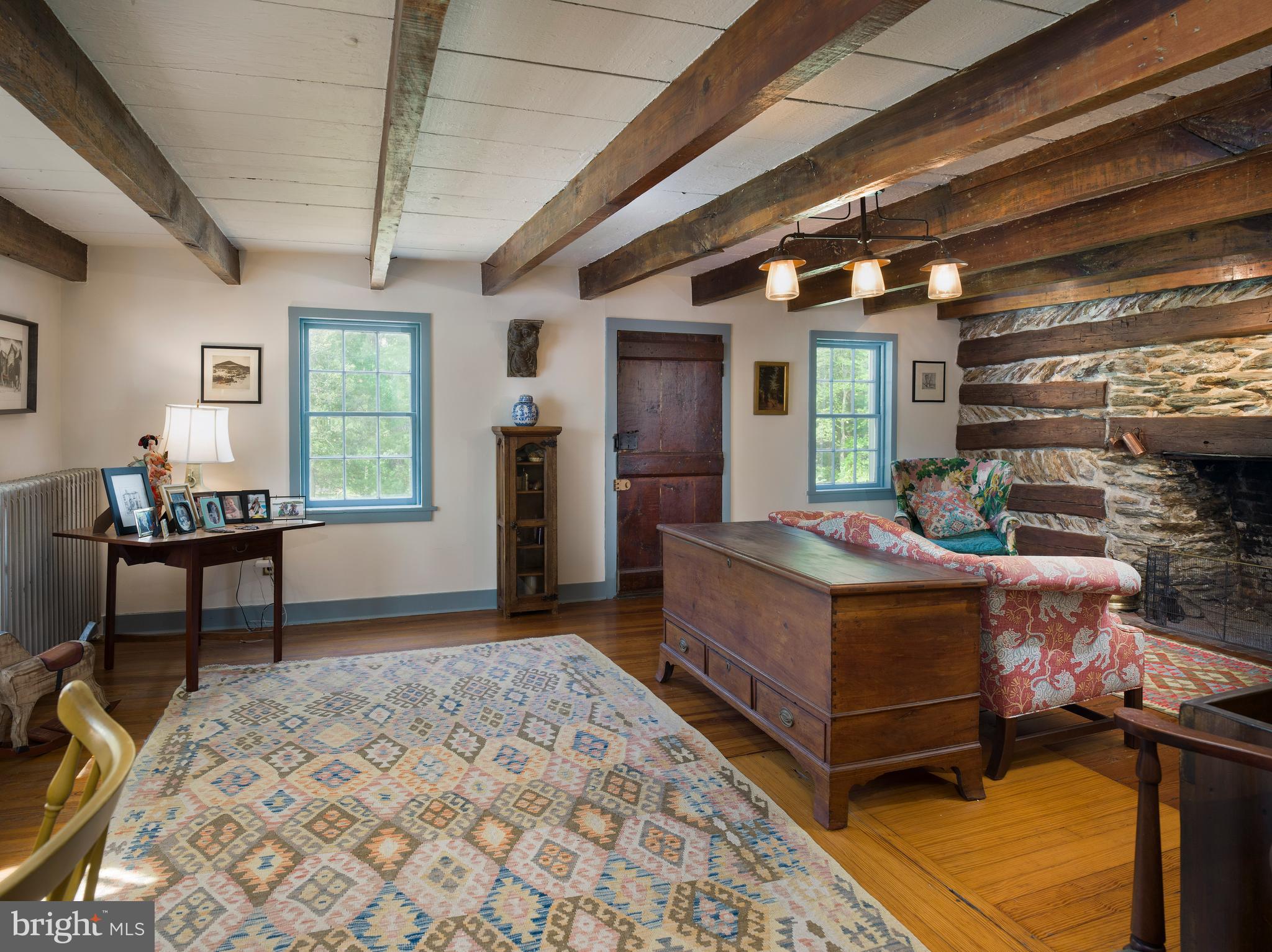 Step inside the original log cabin and you're instantly transported. The heart of the home is a cozy, character-filled living room anchored by a massive stone fireplace, exposed beams, and wide-plank floors. Sunlight filters through storm-protected windows, casting a warm glow over the room's beautifully preserved textures and details. Just beyond, the welcoming entry hall--with its vintage sconces and decorative fireplace--feels like stepping into a simpler, more elegant time.