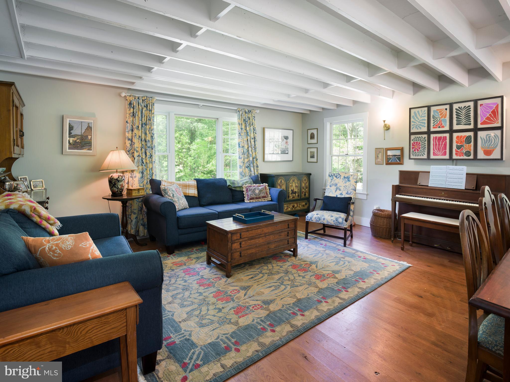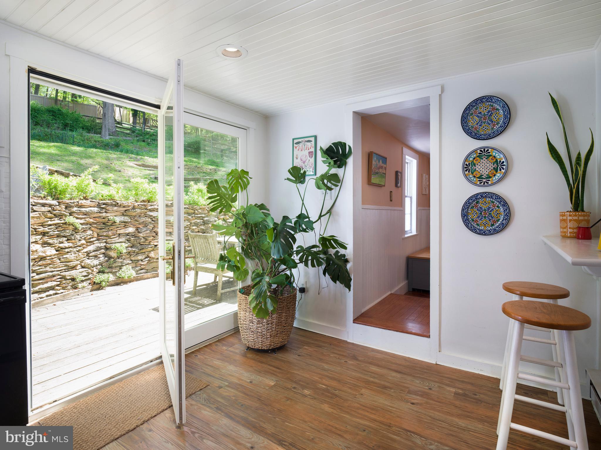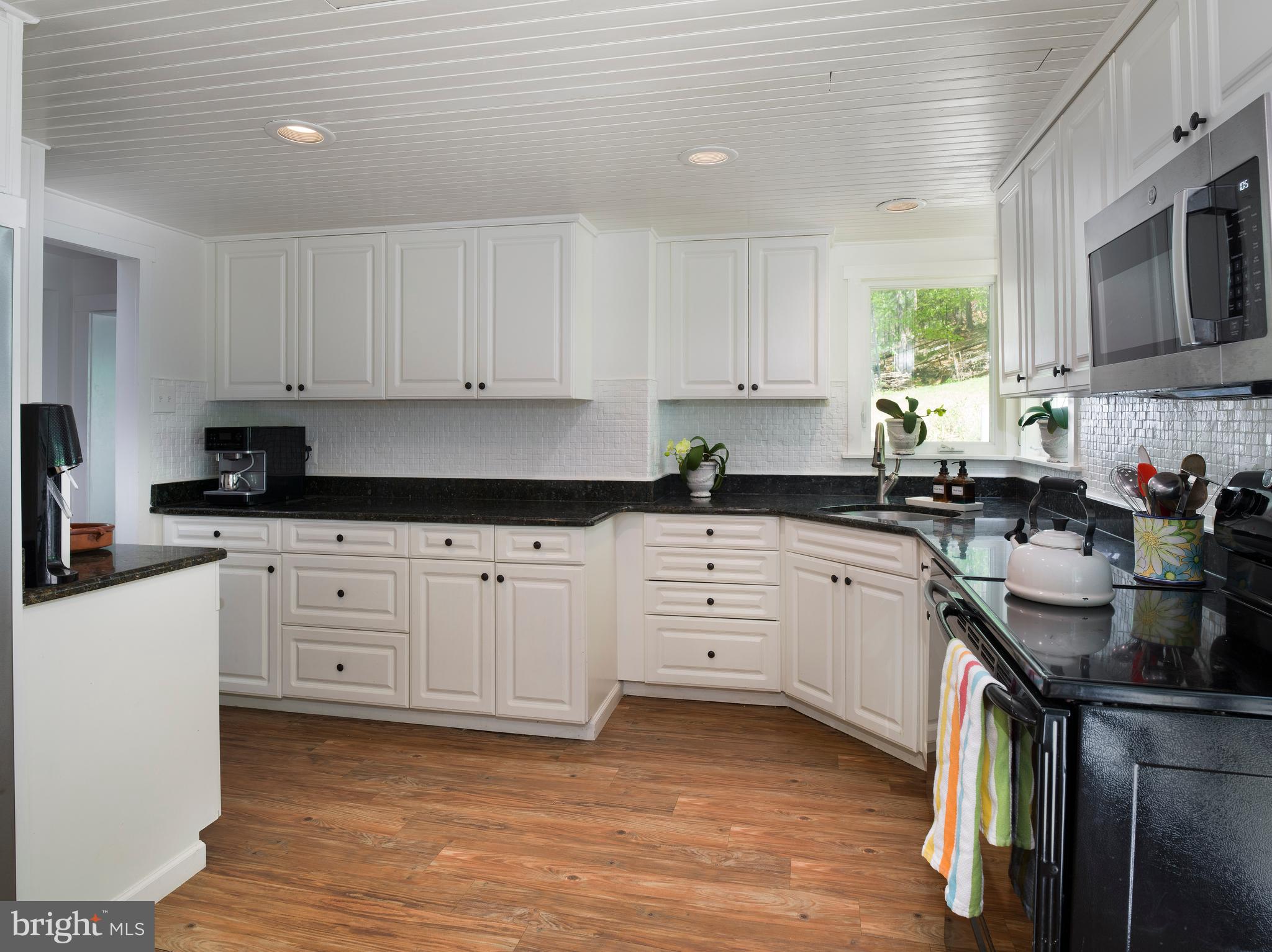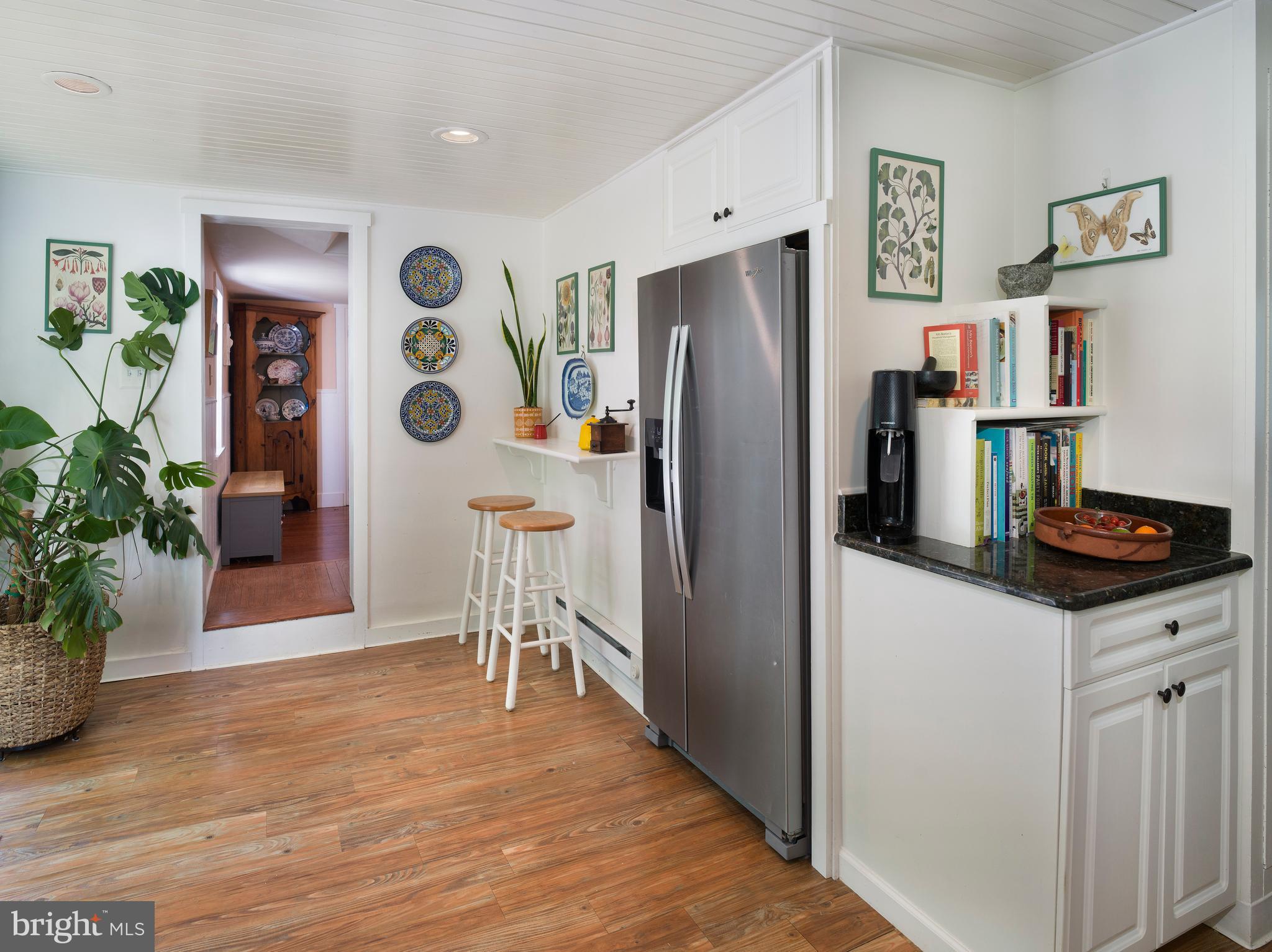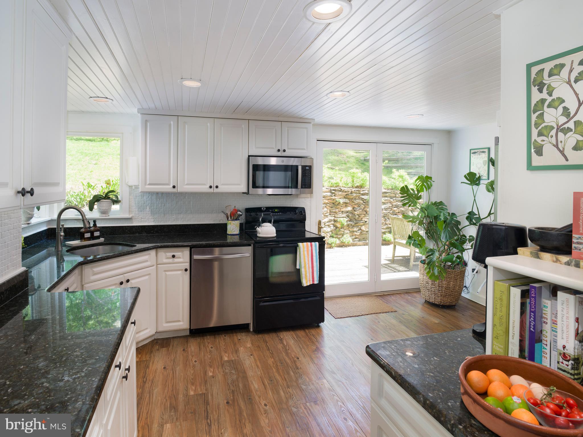 The bright, updated kitchen is as functional as it is charming. Crisp white cabinetry, dark granite counters, stainless steel appliances, and a beadboard ceiling are complemented by direct access to the rear deck--ideal for grilling or dining under the stars. A cozy bar nook, cookbook shelves, and coffee station add personality and ease.