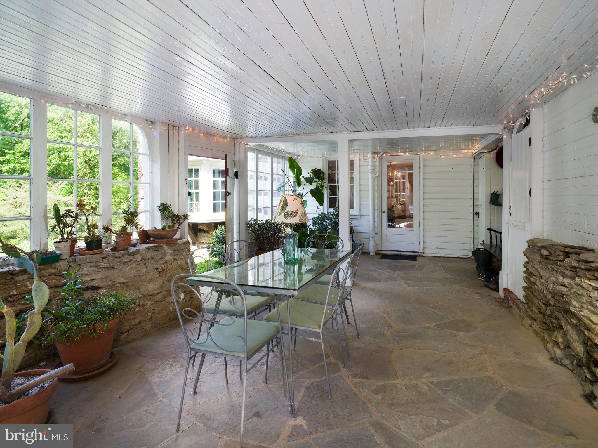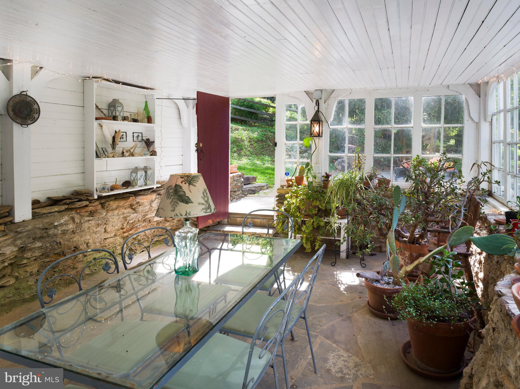 Through the glass-paneled door, a magical sun porch awaits. With its flagstone floor, stone half-walls, and wraparound windows, it's the perfect spot for morning coffee, casual dinners, or evenings strung with fairy lights and filled with laughter.