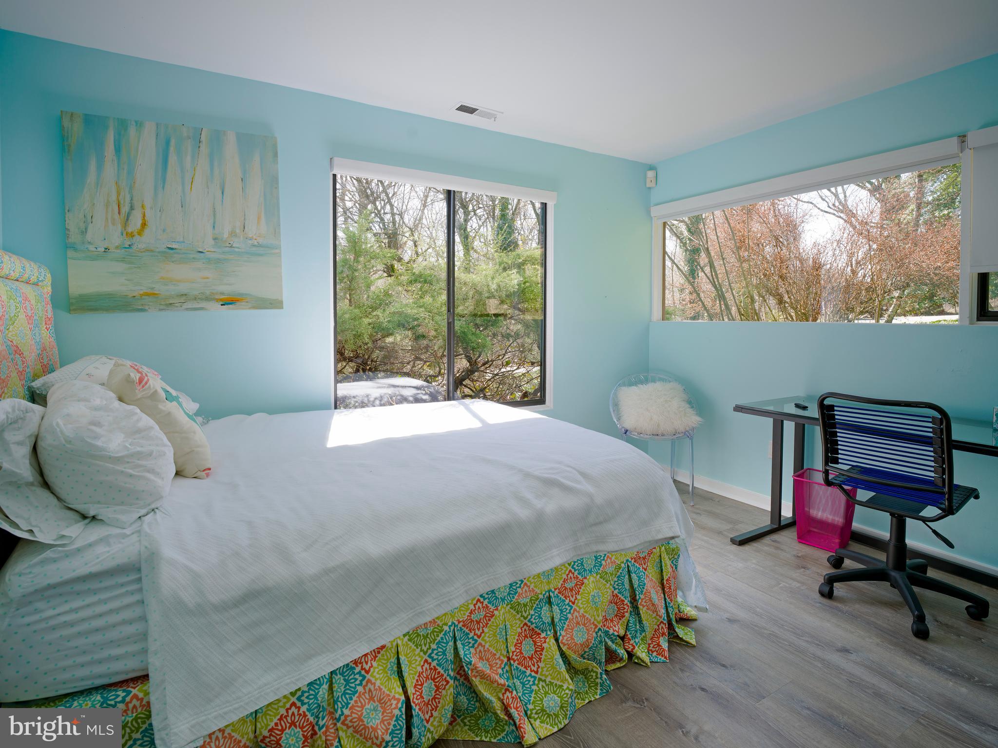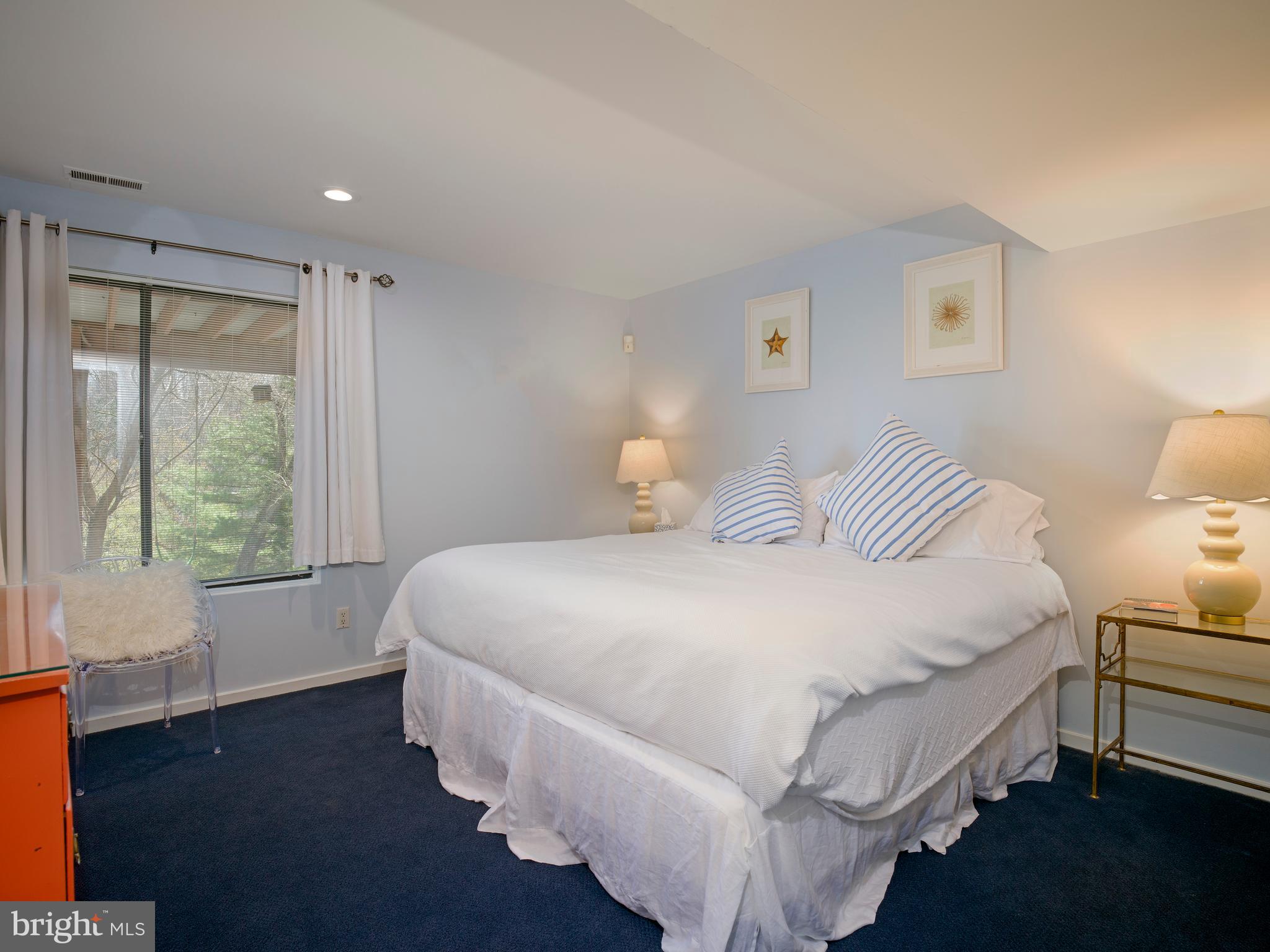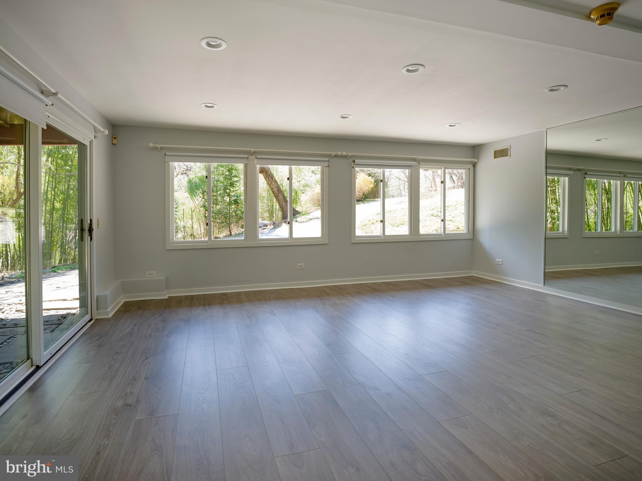 The lower level includes five additional bedrooms, 2 bathrooms, a laundry room, and a spacious recreation room with multiple windows and sliding glass doors, providing direct outdoor access.