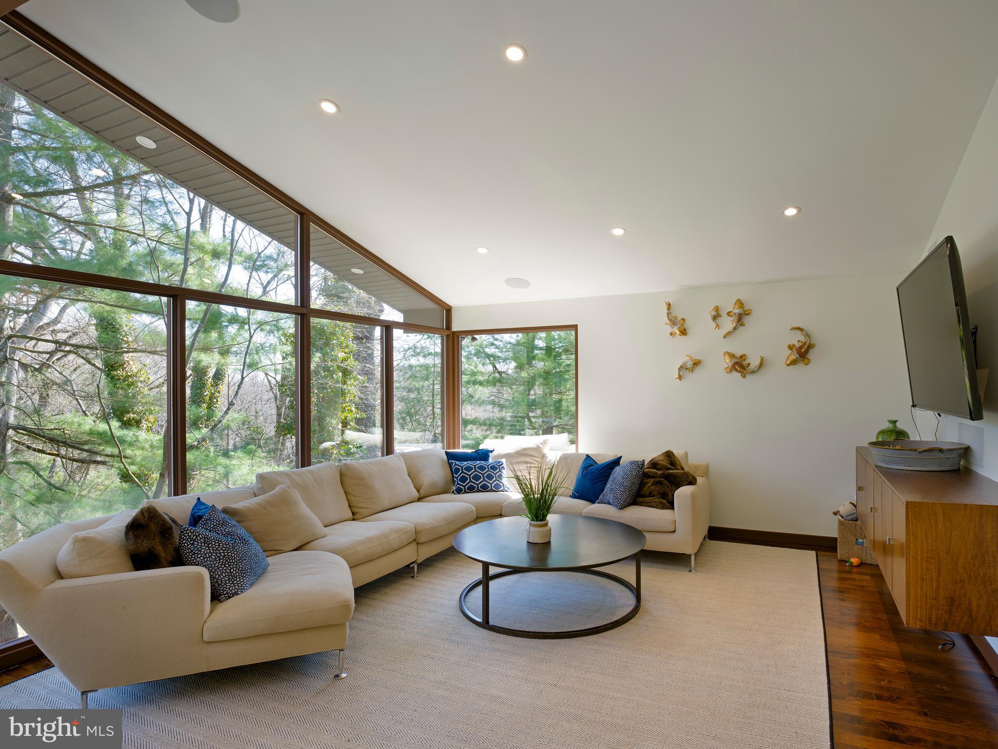 Beyond the gated entrance, a long, winding drive leads to a sophisticated yet understated residence highlighted by soaring ceilings, walls of glass, and rich wood accents throughout. A dramatic glass atrium-style reception hall with slate flooring creates a striking first impression. The stunning living room boasts a vaulted ceiling and an impressive window wall, filling the space with natural light and offering serene views of the surrounding landscape.