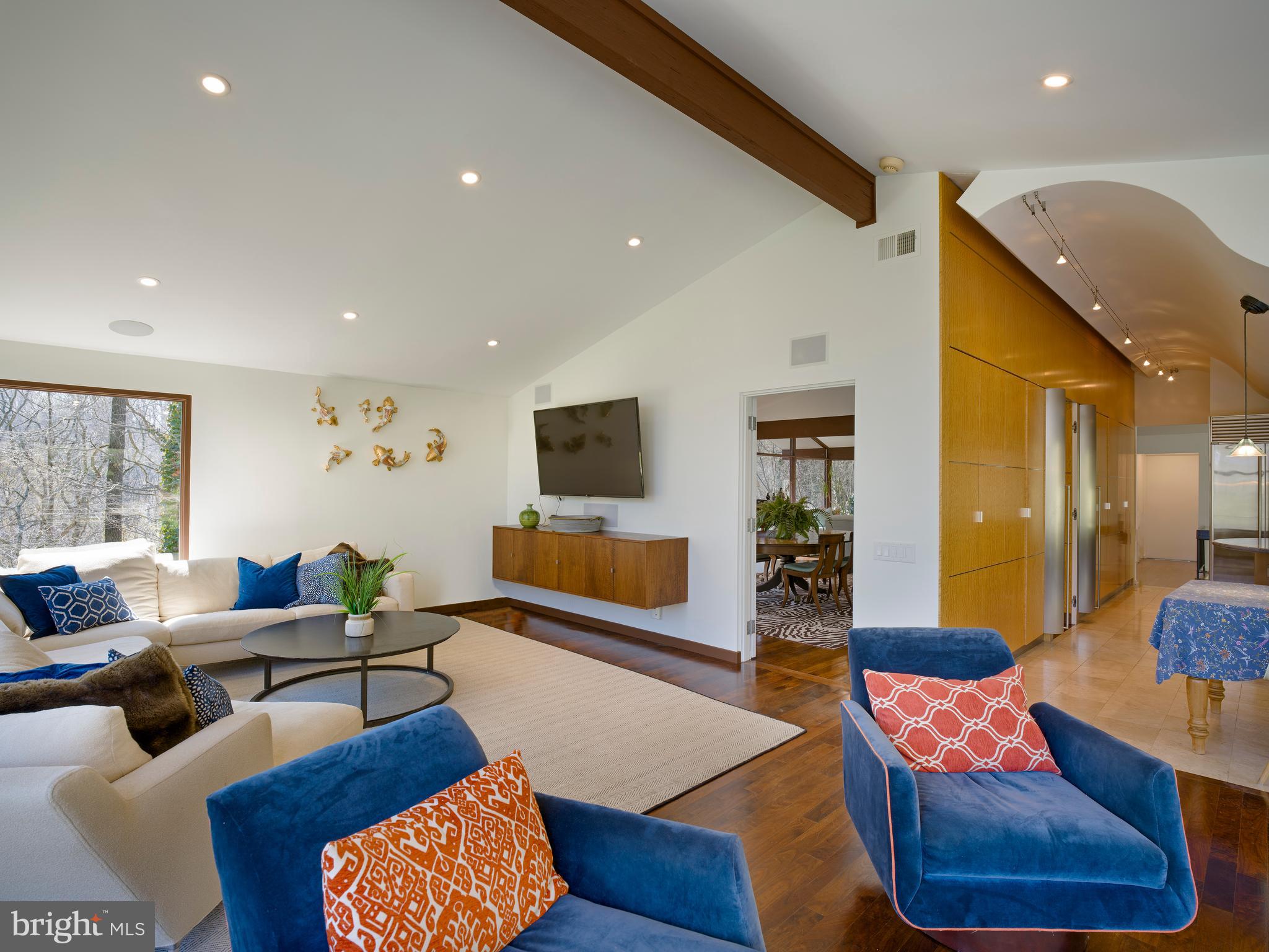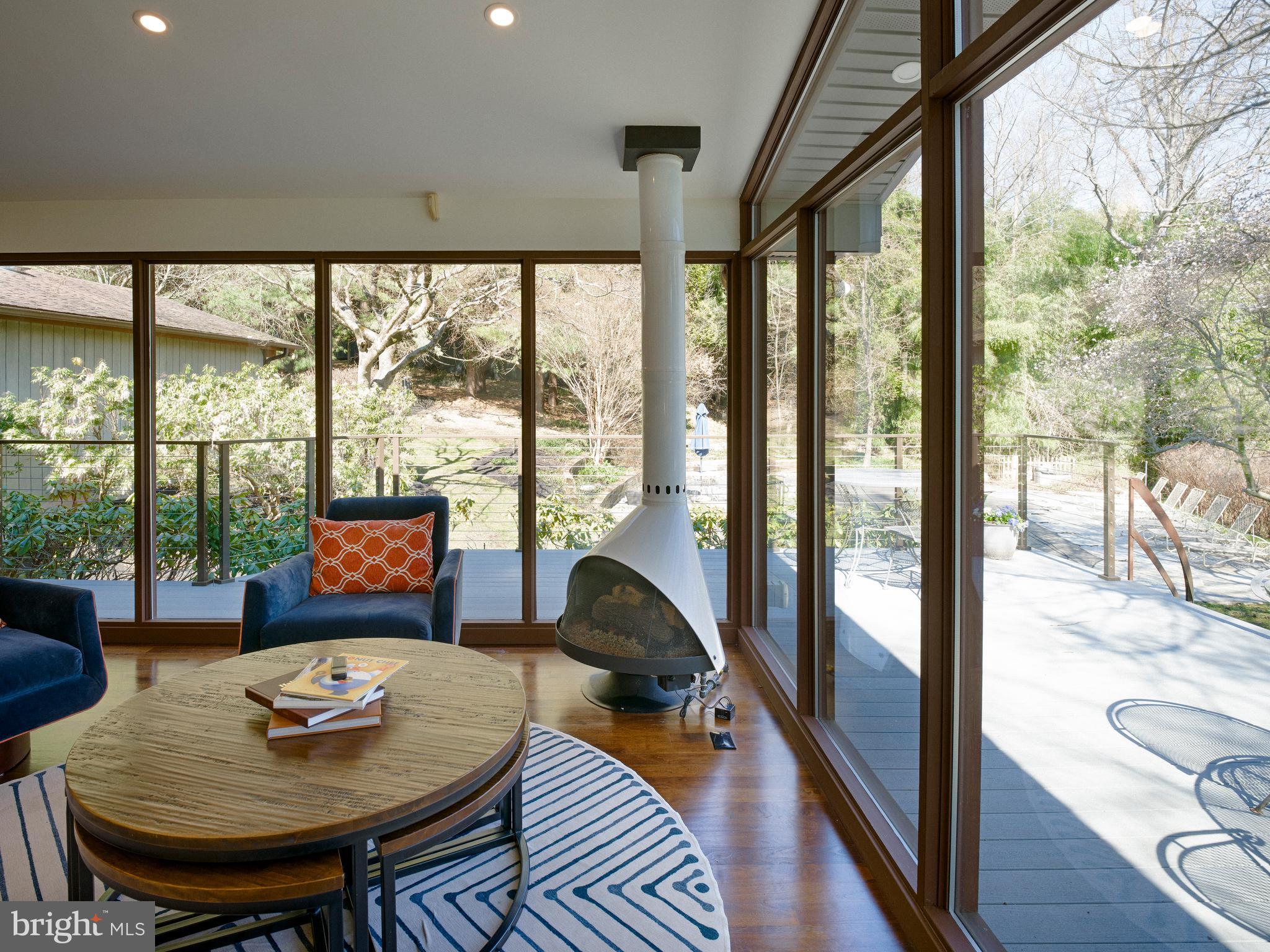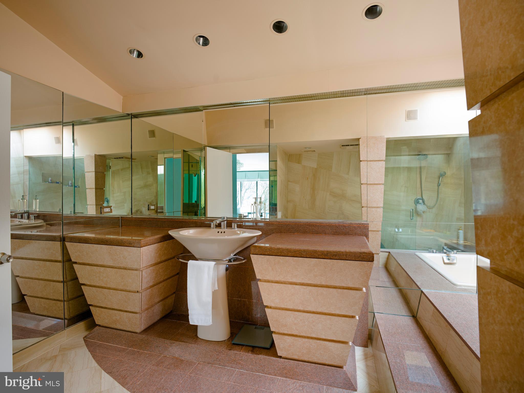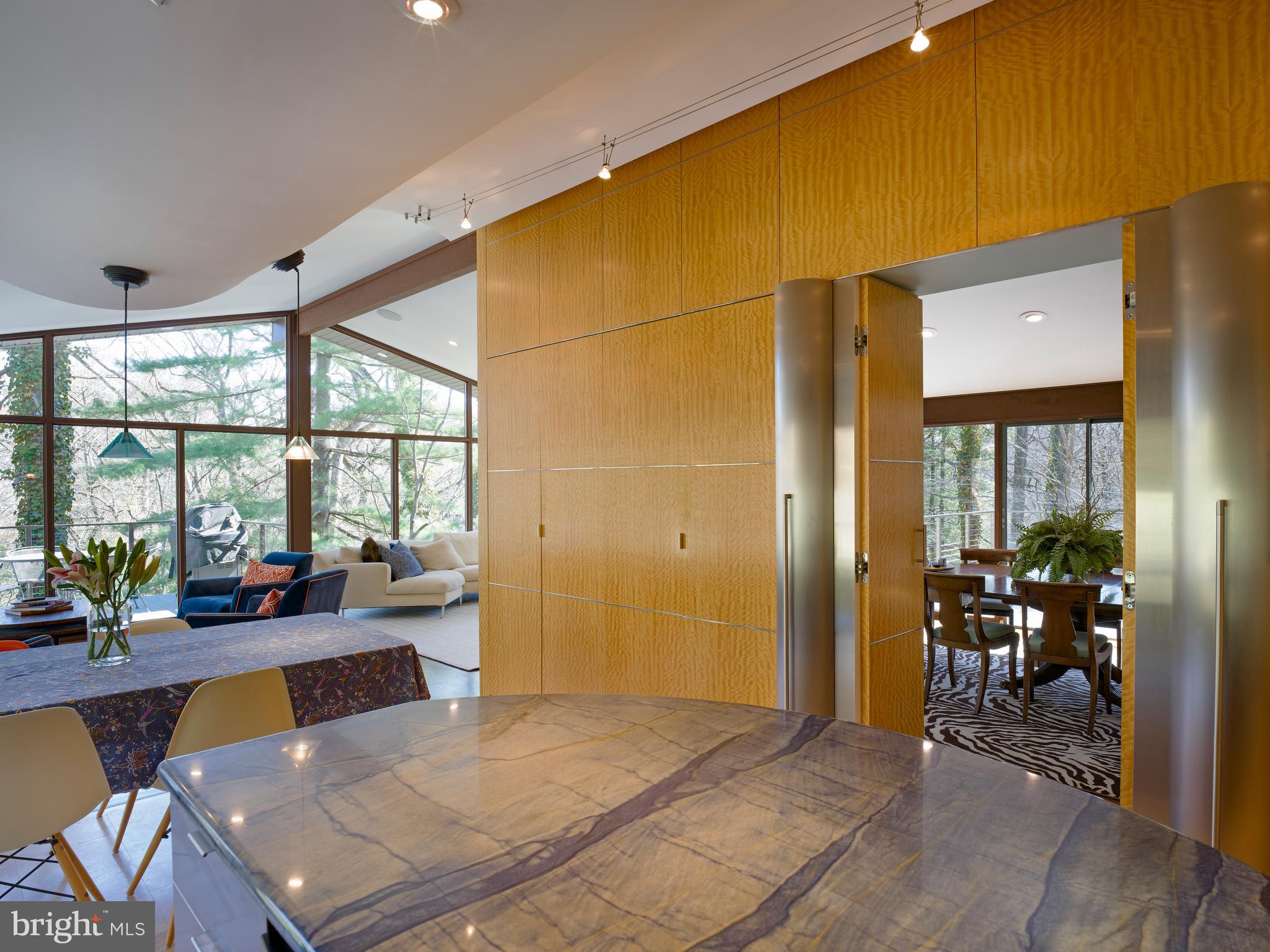 The adjacent dining room, also with a vaulted ceiling and glass walls, provides seamless access to a wraparound deck--perfect for indoor-outdoor entertaining. The gourmet, center-island kitchen is a true showpiece, featuring exotic wood and stainless steel cabinetry, Blue Macaubas granite countertops, honed limestone floors, with premium appliances. Glass doors lead directly to the deck and pool area.
