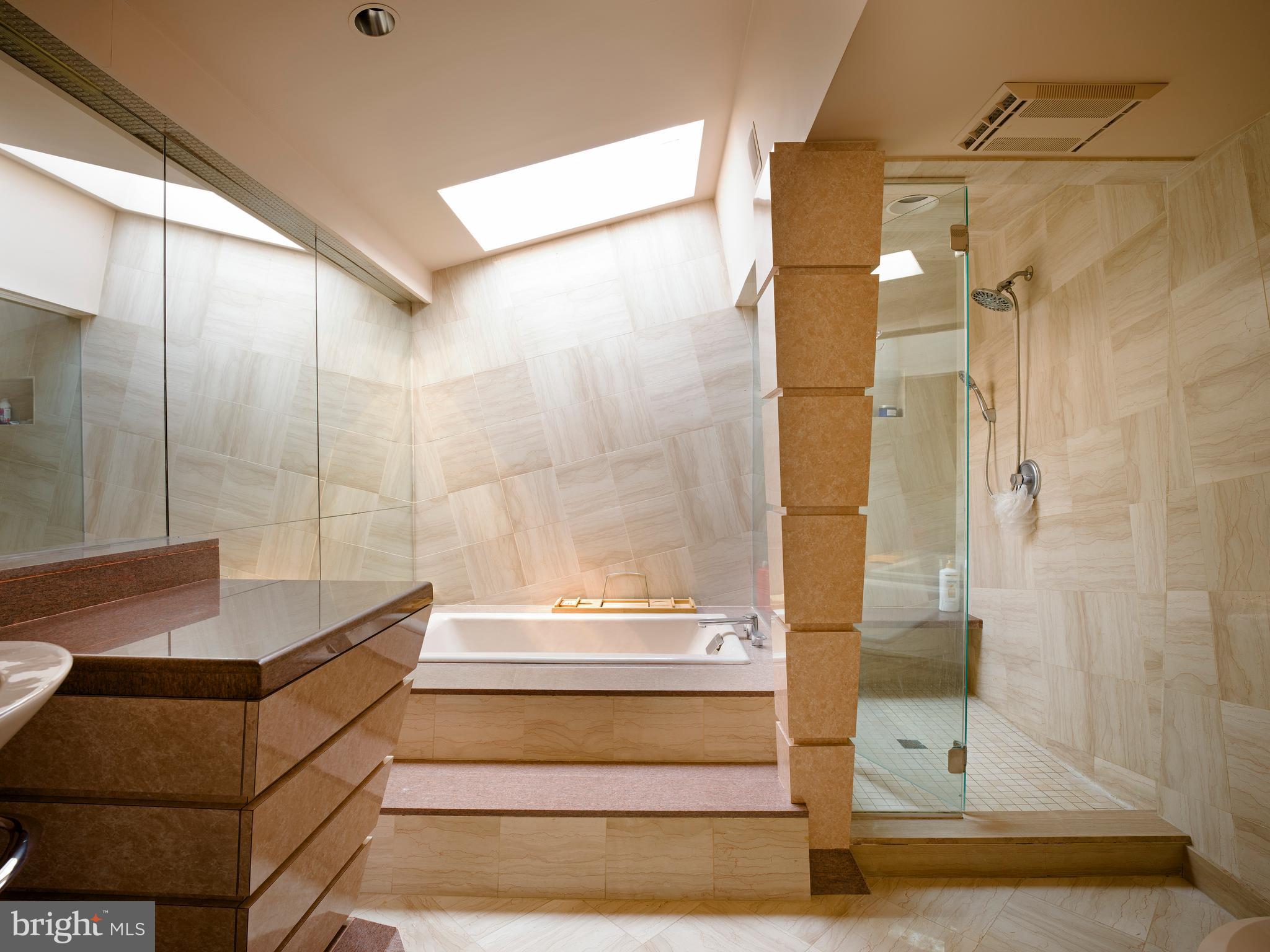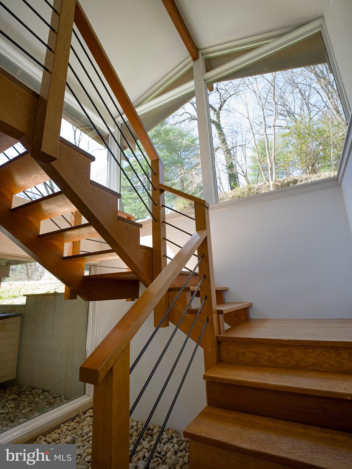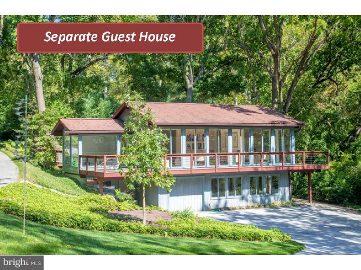 In harmony with the main residence, the guest house (built in 1990) offers approximately 1,000 square feet on the upper level, which could be used as a spacious home office with a sink, dishwasher, refrigerator, powder room, and access to a private deck through sliding glass doors. The lower level features an exercise room, full bath with shower, and a one-car garage.