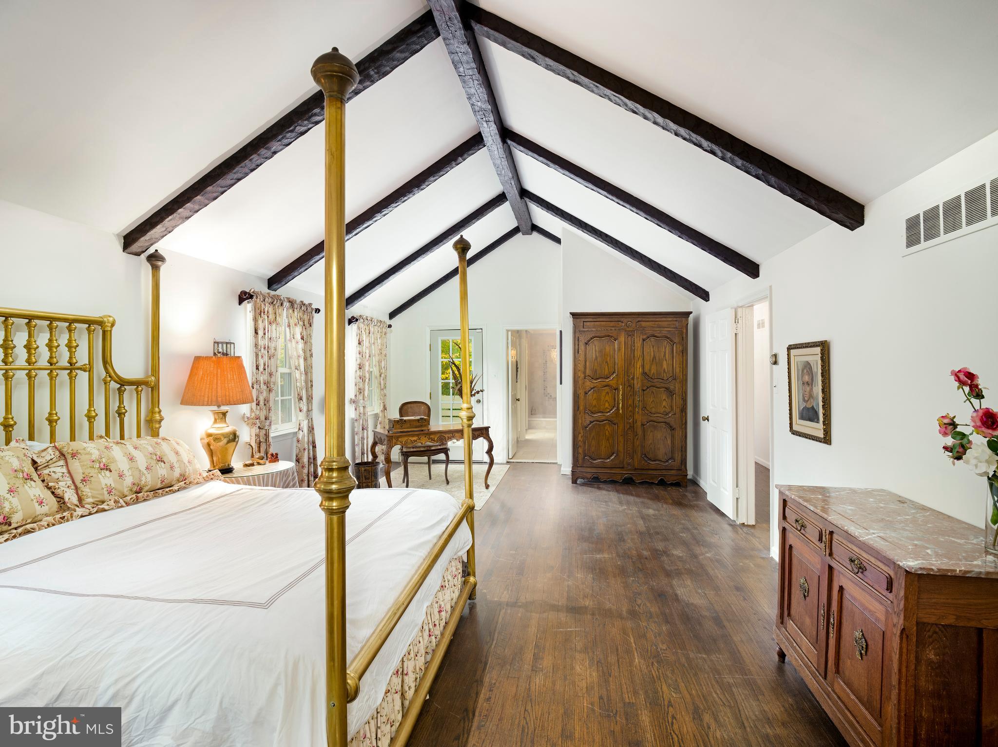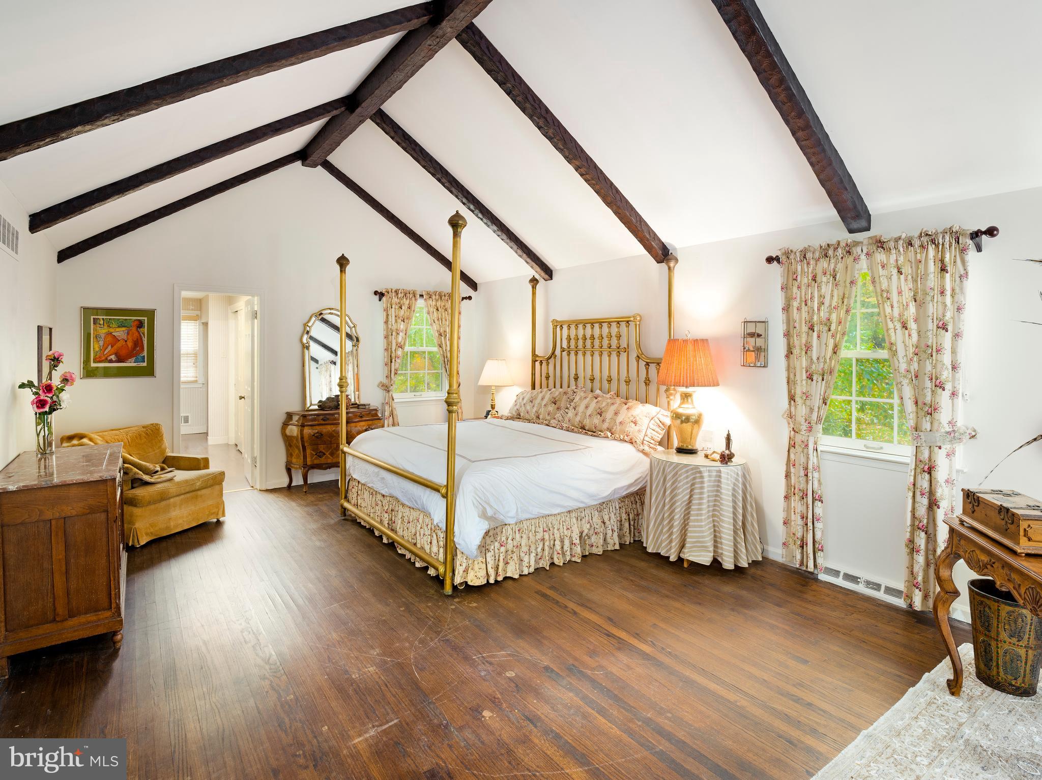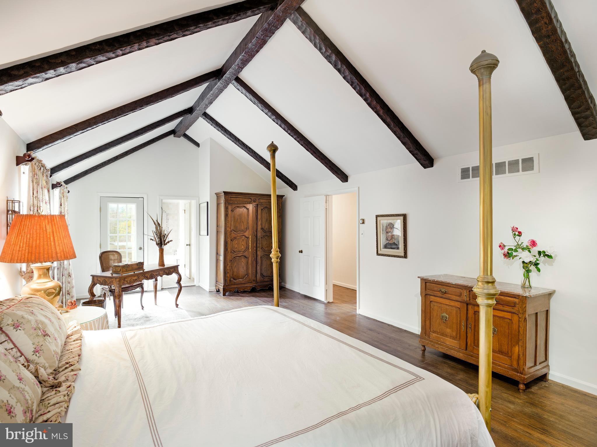 Upstairs, the primary suite features vaulted, beamed ceilings, a private balcony overlooking the rear grounds, and separate his and her bathrooms. Four additional bedrooms complete this level, served by two full hall baths; one includes its own half bath, ideal for guests.