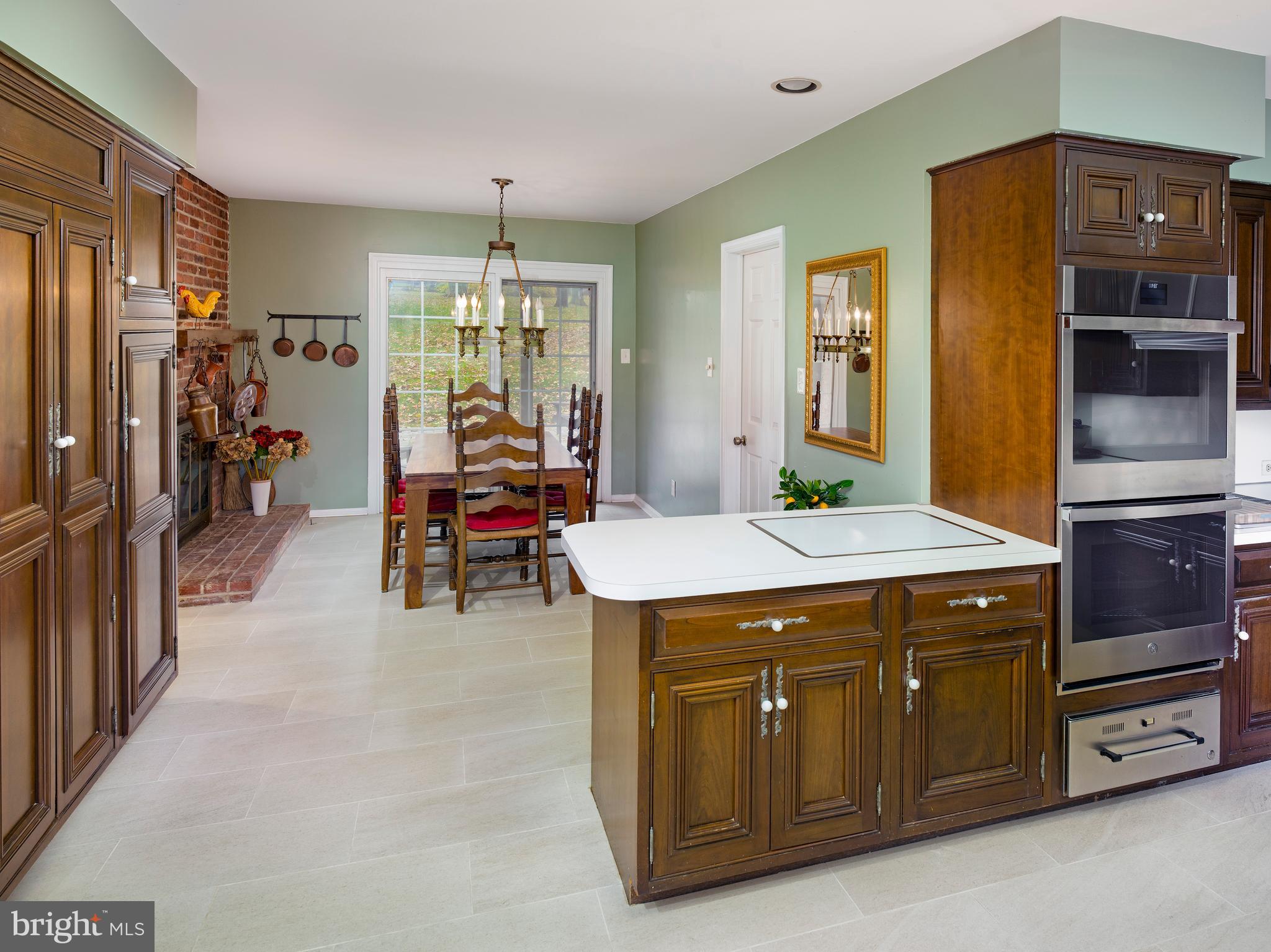 The kitchen and family room are joined by a double-sided stone fireplace, connecting the cooking and entertaining spaces. The kitchen includes an eat-in breakfast area, while the family room features beamed ceilings, doors leading to the patio and rear grounds.