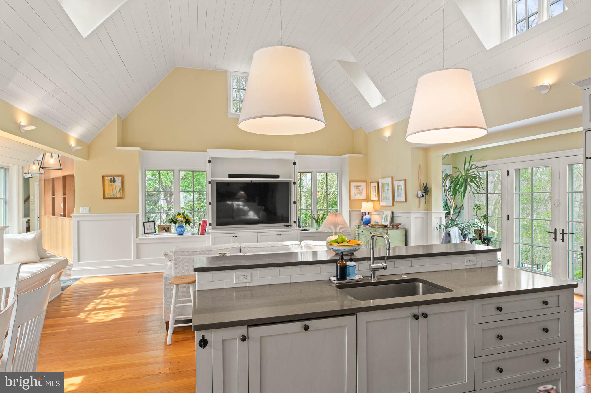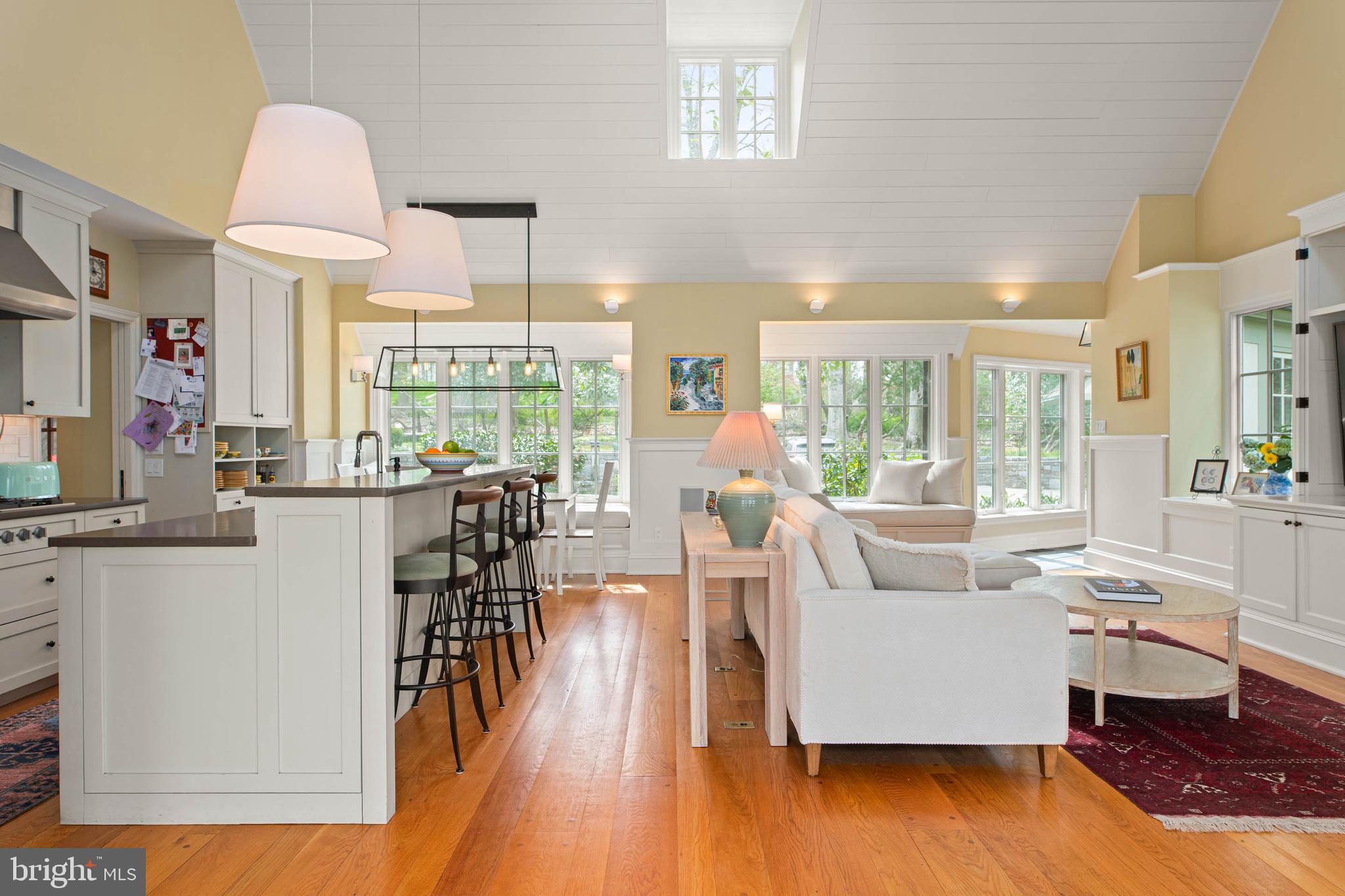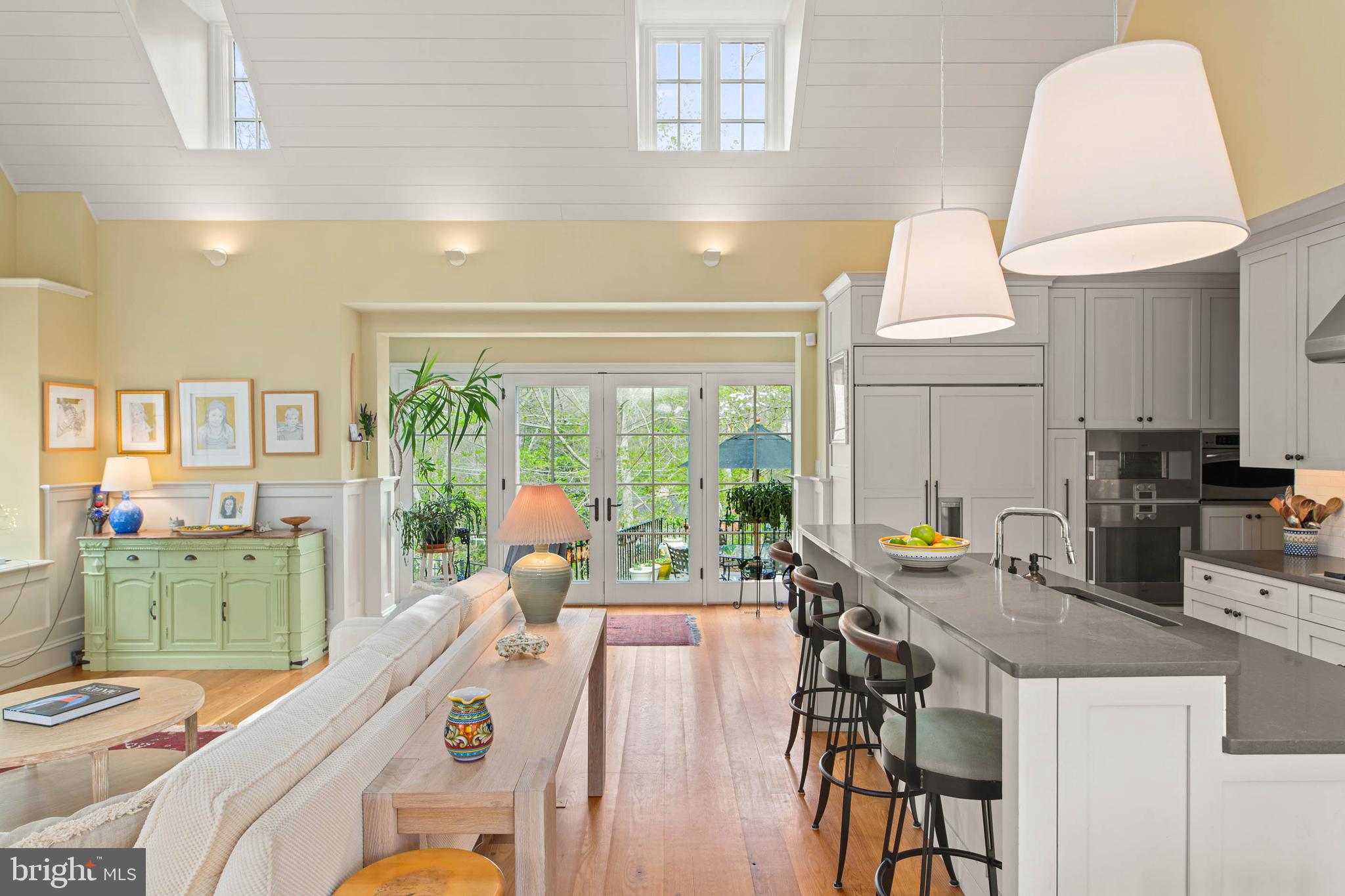The home transitions into a fully reimagined kitchen, dining, and family room, designed as the home's central gathering space. A vaulted ceiling, expansive windows, and direct access to the grounds bring in natural light throughout the day. The kitchen is equipped with high-end appliances, a large island with seating, and adjacent informal dining, all flowing seamlessly into the family room.