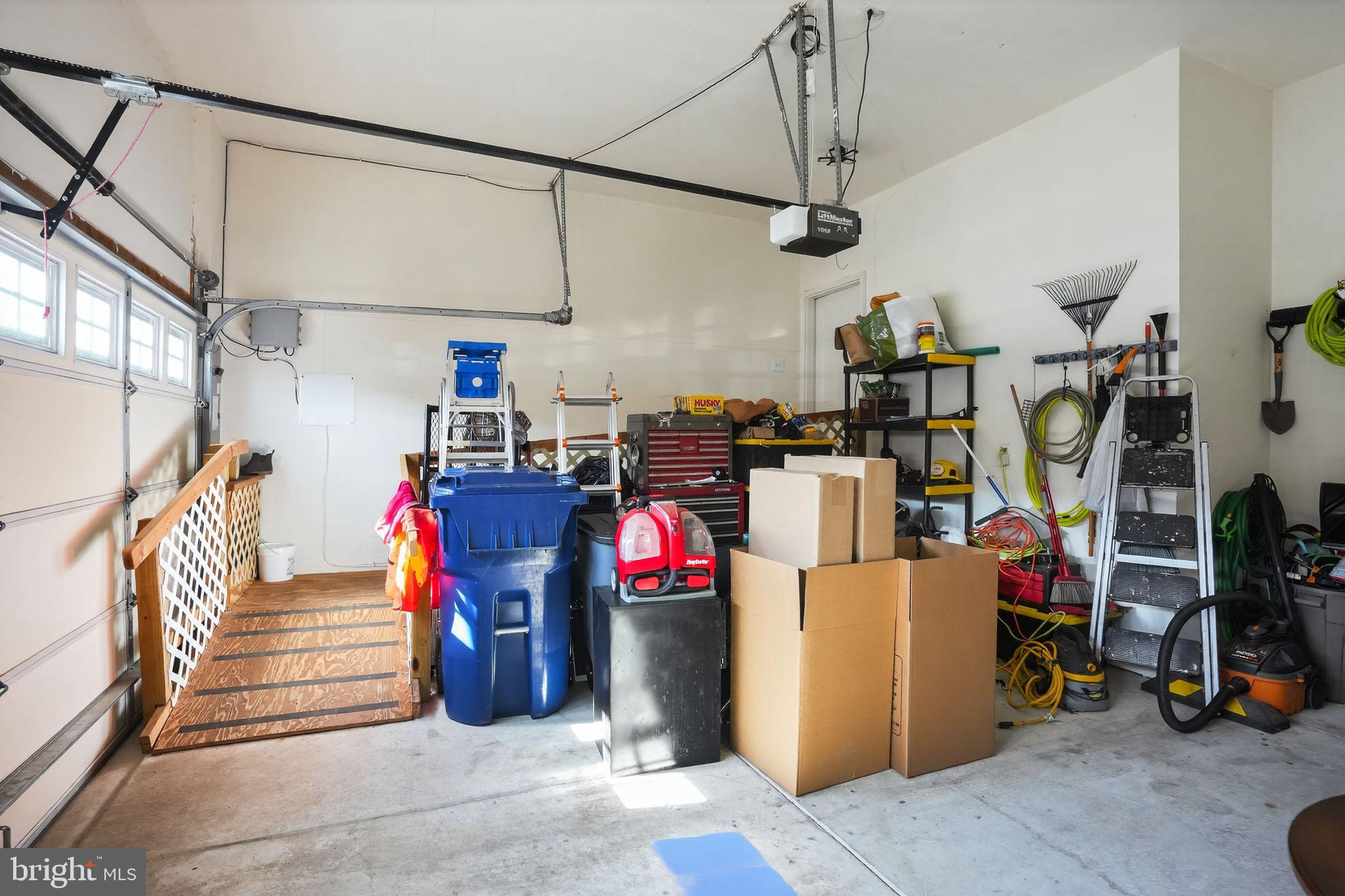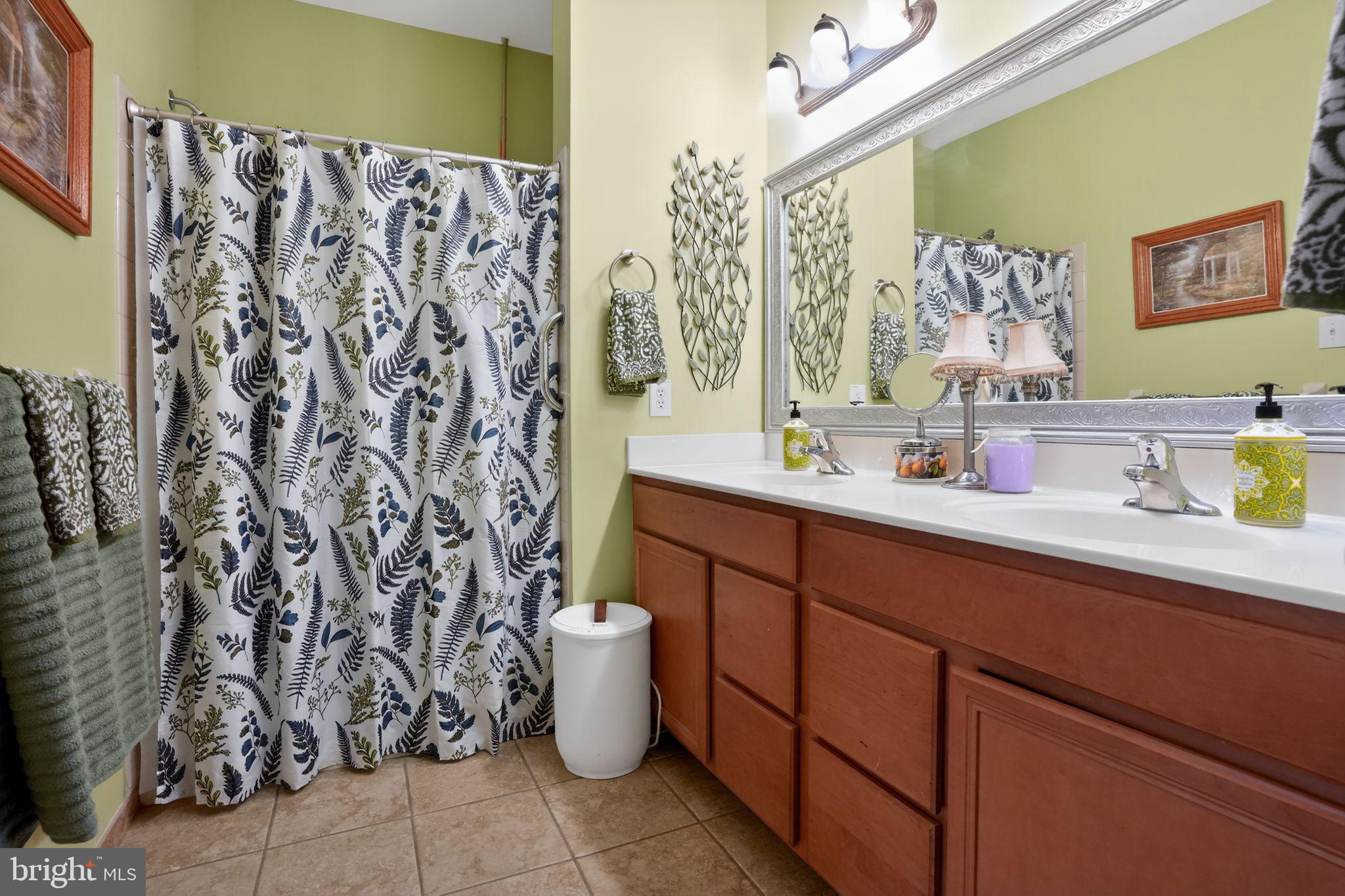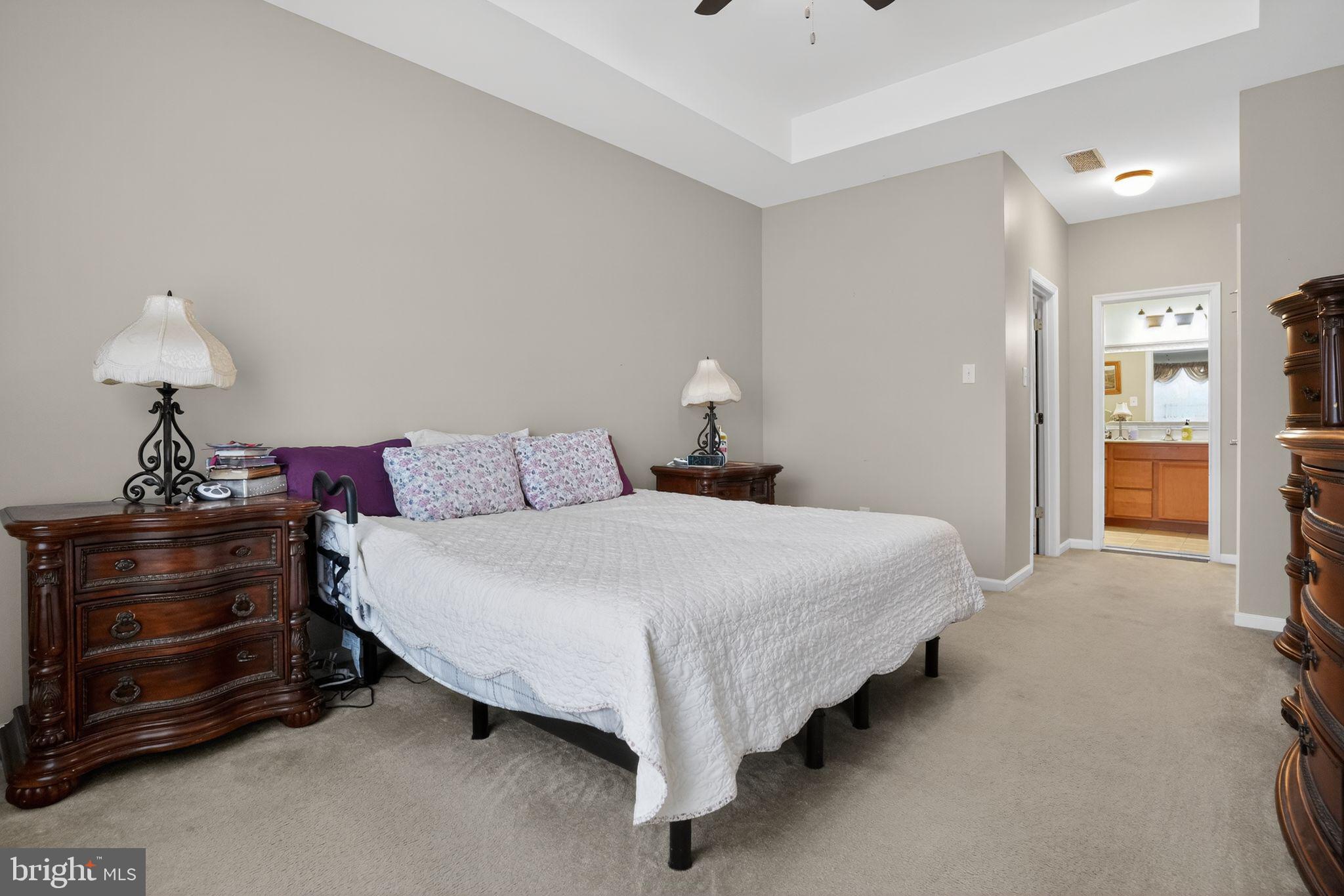The main-level primary suite offers a peaceful escape with a tray ceiling, walk-in closet, additional closet, and linen closet. The private ensuite bath features a dual-sink wood vanity, tile flooring, and a walk-in shower with built-in seat and grab bars. A conveniently located laundry room and interior access to the two-car garage--with a built-in wooden ramp--complete the main floor.