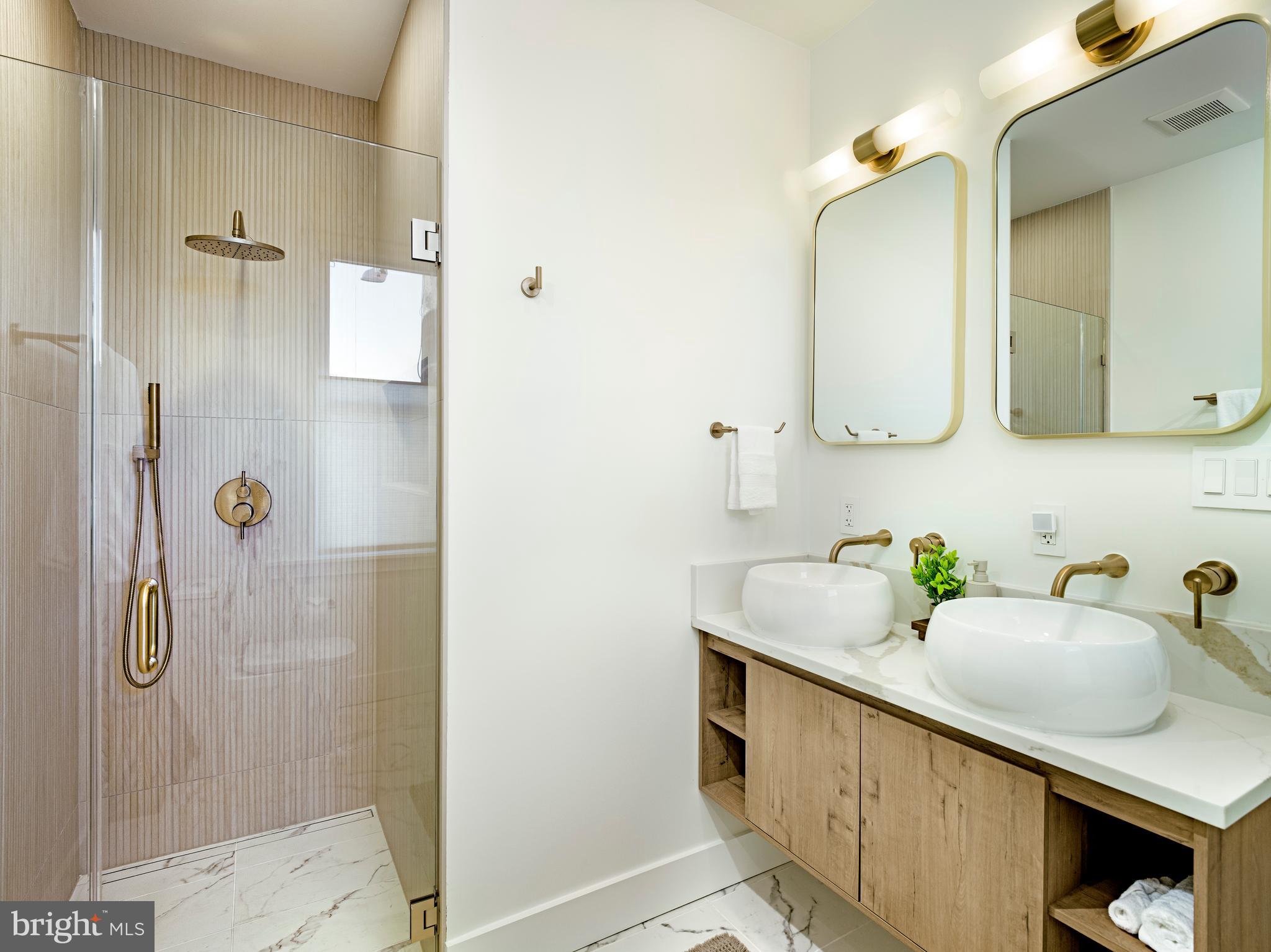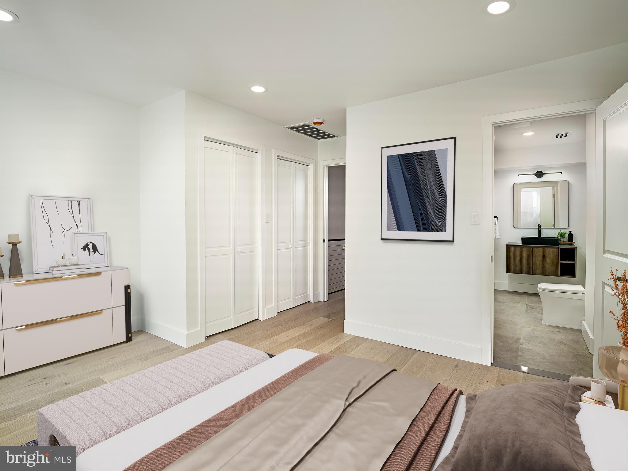On the second level, discover three serene bedrooms and two full baths -- one within a private bedroom suite featuring double sinks and a walk-in shower, and another accessible from the hallway. A laundry closet in the hall adds convenience. Each room includes custom closets and reflects comfort, balance, and quiet sophistication.