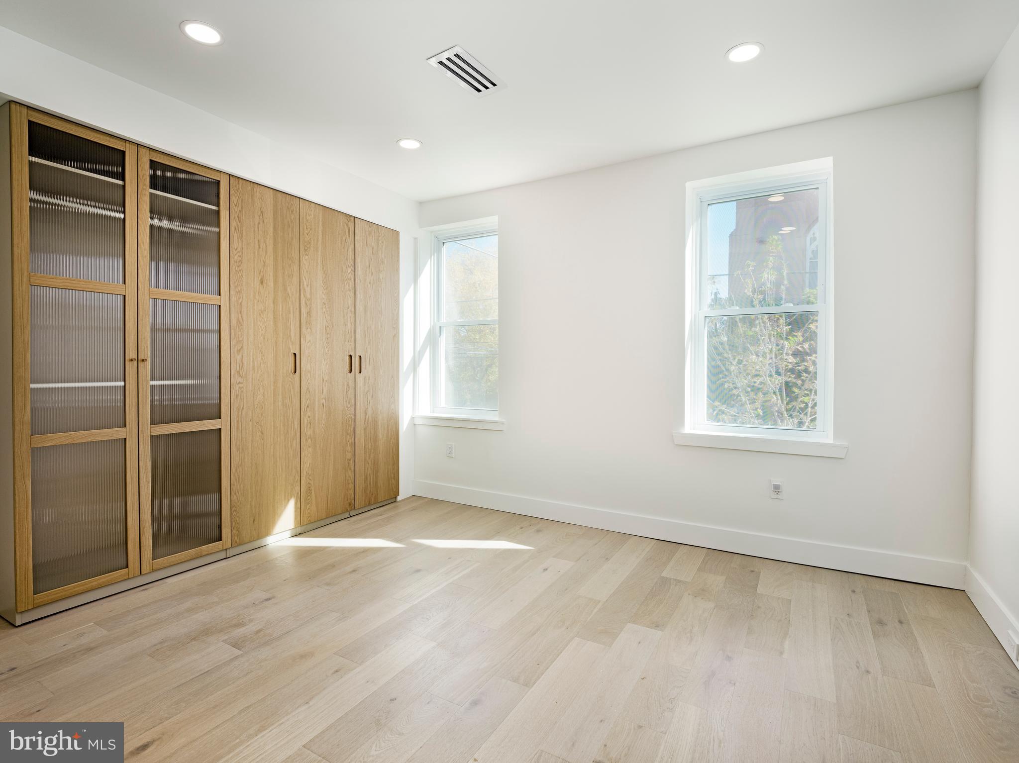 The third level is an elevated retreat -- home to the fourth bedroom, a full bath, and direct walkout access to the roof deck. The deck is a showpiece, crafted entirely of wood, creating a private, natural atmosphere above the city. From here, the 1863 Annunciation church steeple rises to the east, while the sun sets across the opposite horizon, bathing the space in golden light. With 360-degree views, this roof deck offers a truly peaceful city escape in every direction.
