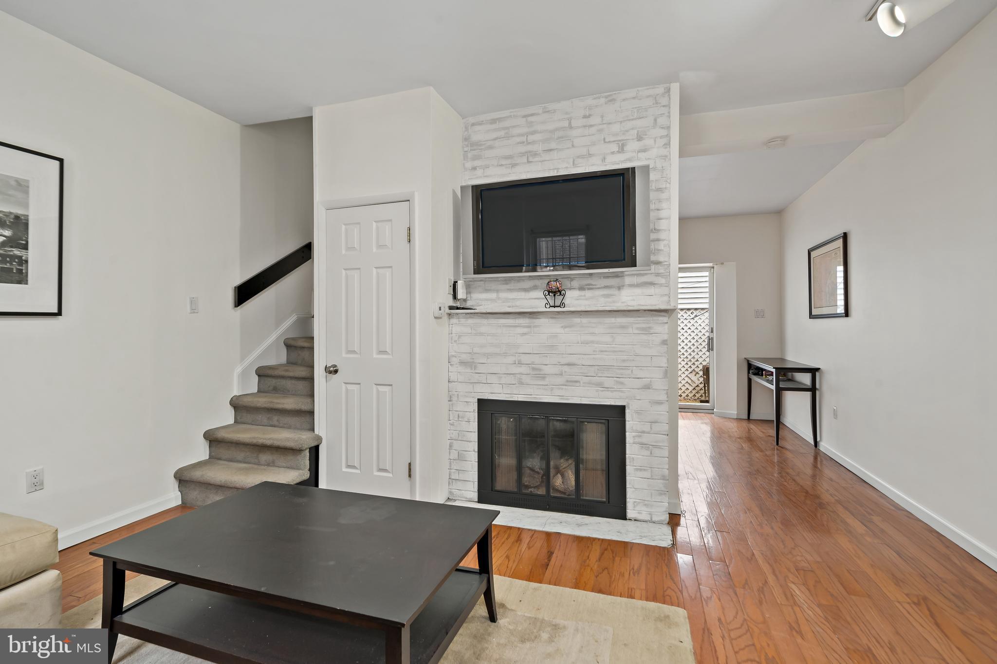 Upon entry, you'll be greeted by an open and airy living space with warm hardwood floors throughout. The bright and spacious living room features a modern electric fireplace and ample natural light, making it the perfect spot for relaxing or entertaining. The kitchen boasts sleek white cabinetry, new stainless-steel appliances, and plenty of counter space. The adjacent dining area offers a useful spot for meals or casual gatherings. This level also has sliders to a sizable private patio--an ideal space for outdoor dining or unwinding.