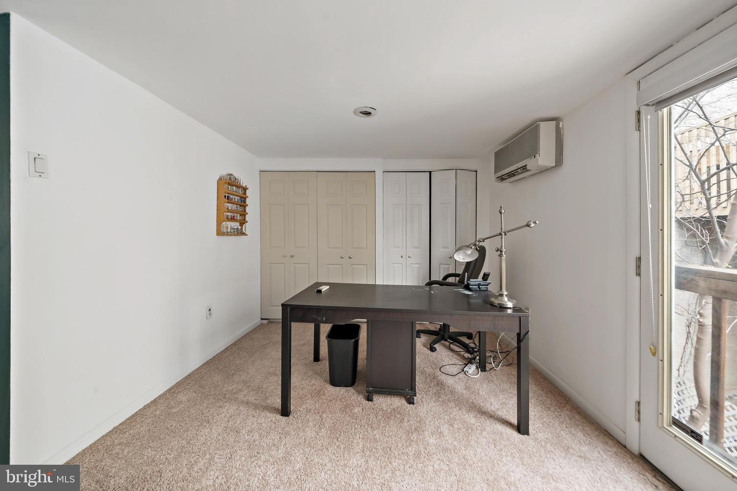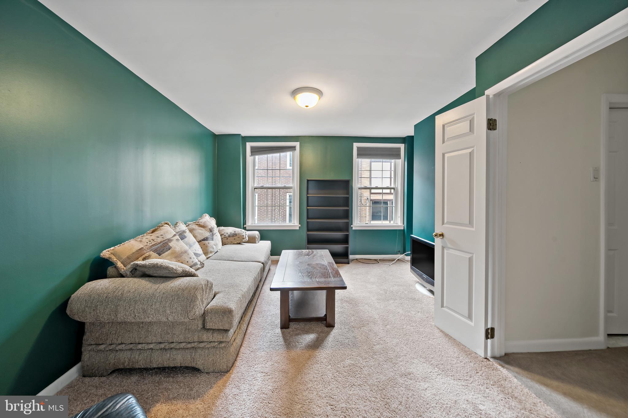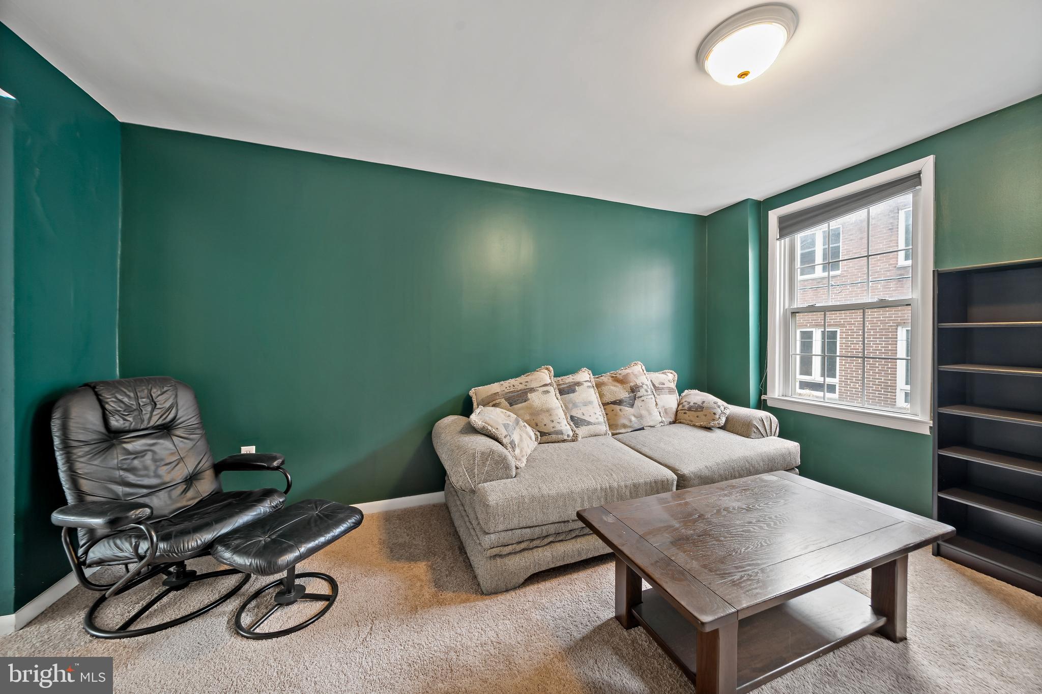 Take the stairs to the second floor, where you'll find the first of the two bedrooms (currently being used as a second living room and office), a full bath and conveniently located washer and dryer. This floor is spacious and light-filled, offering flexibility with the bedroom and den layout.