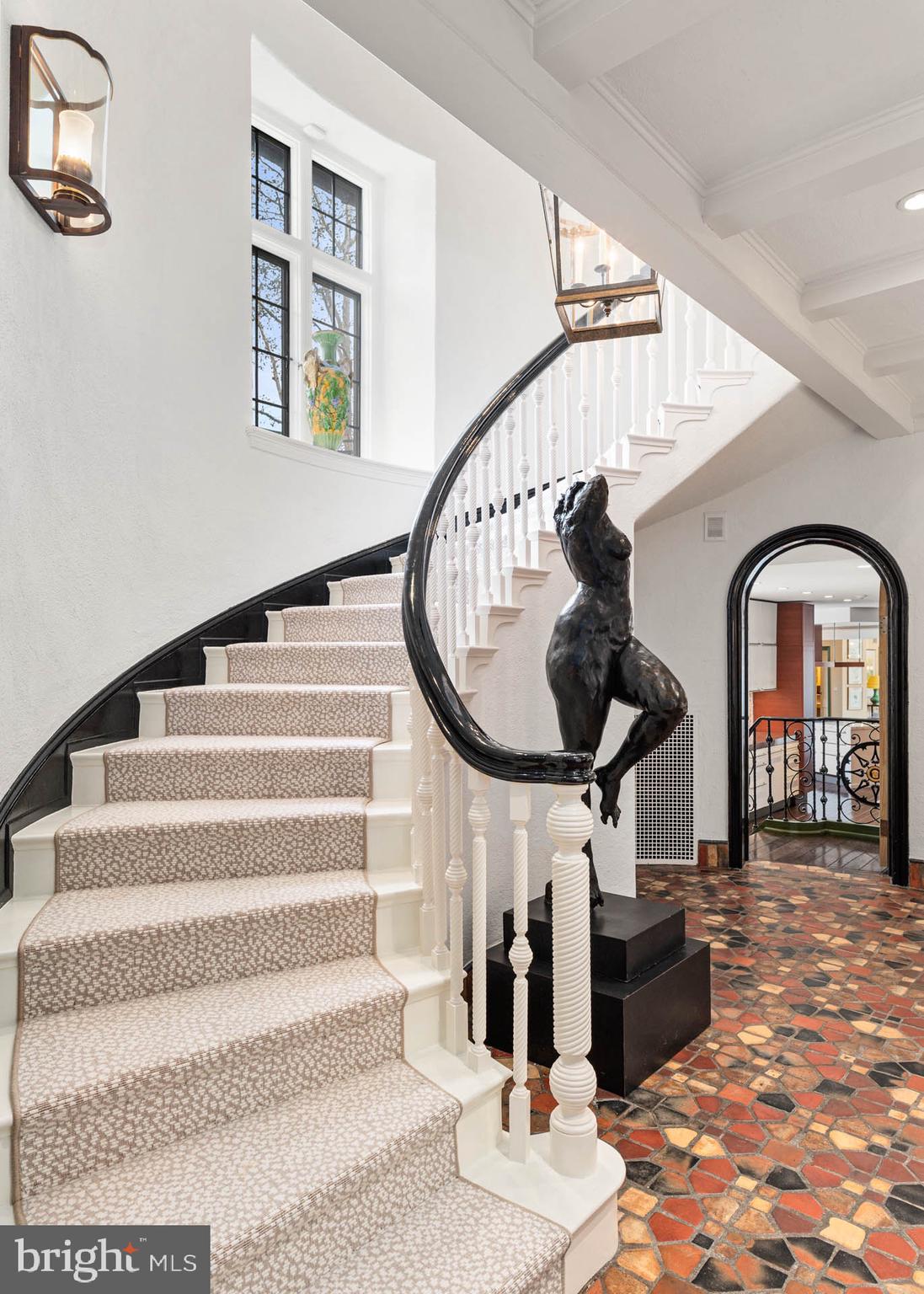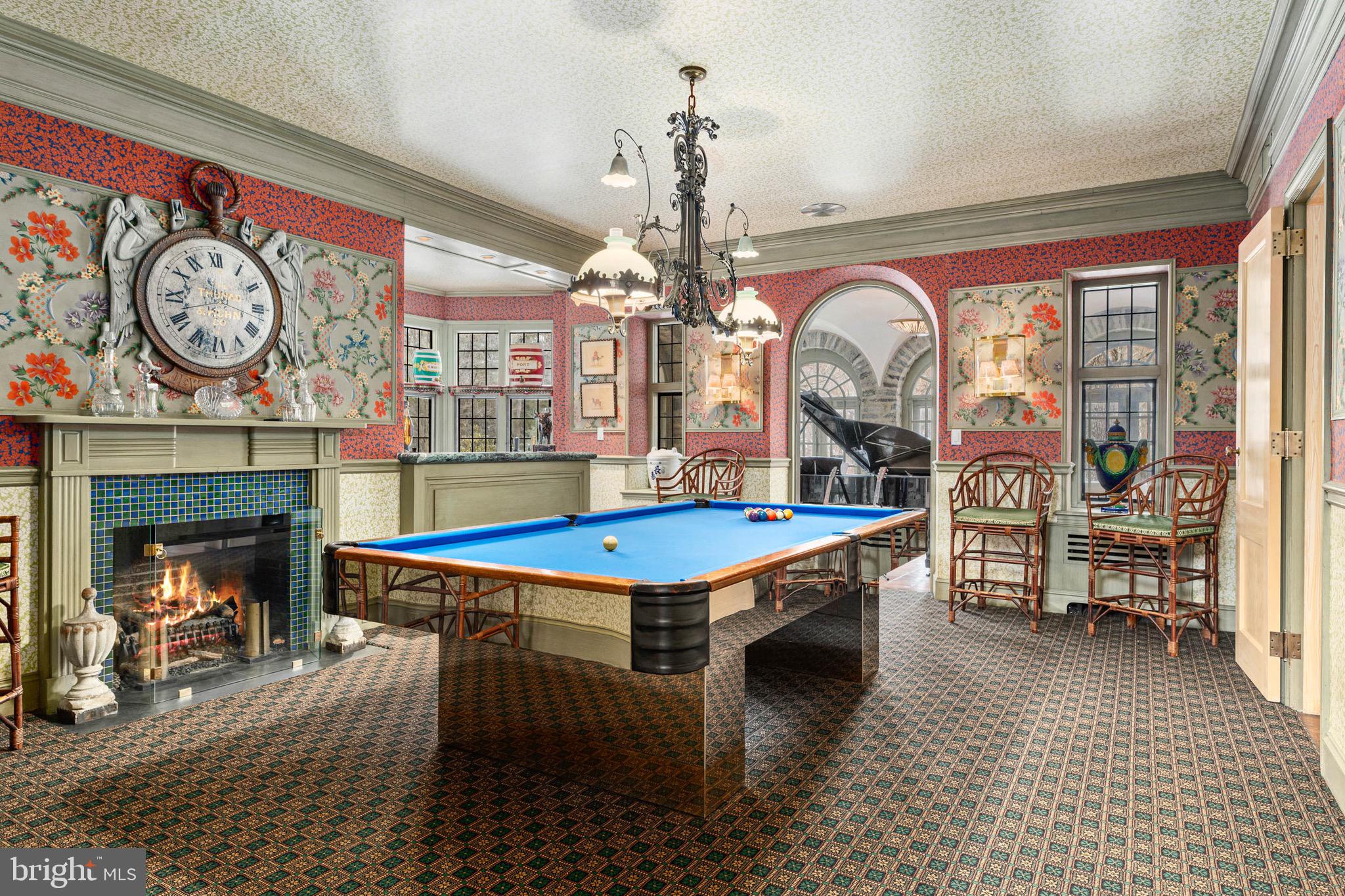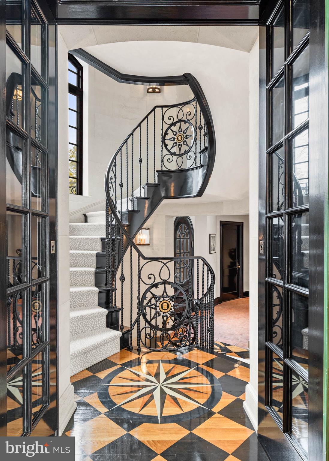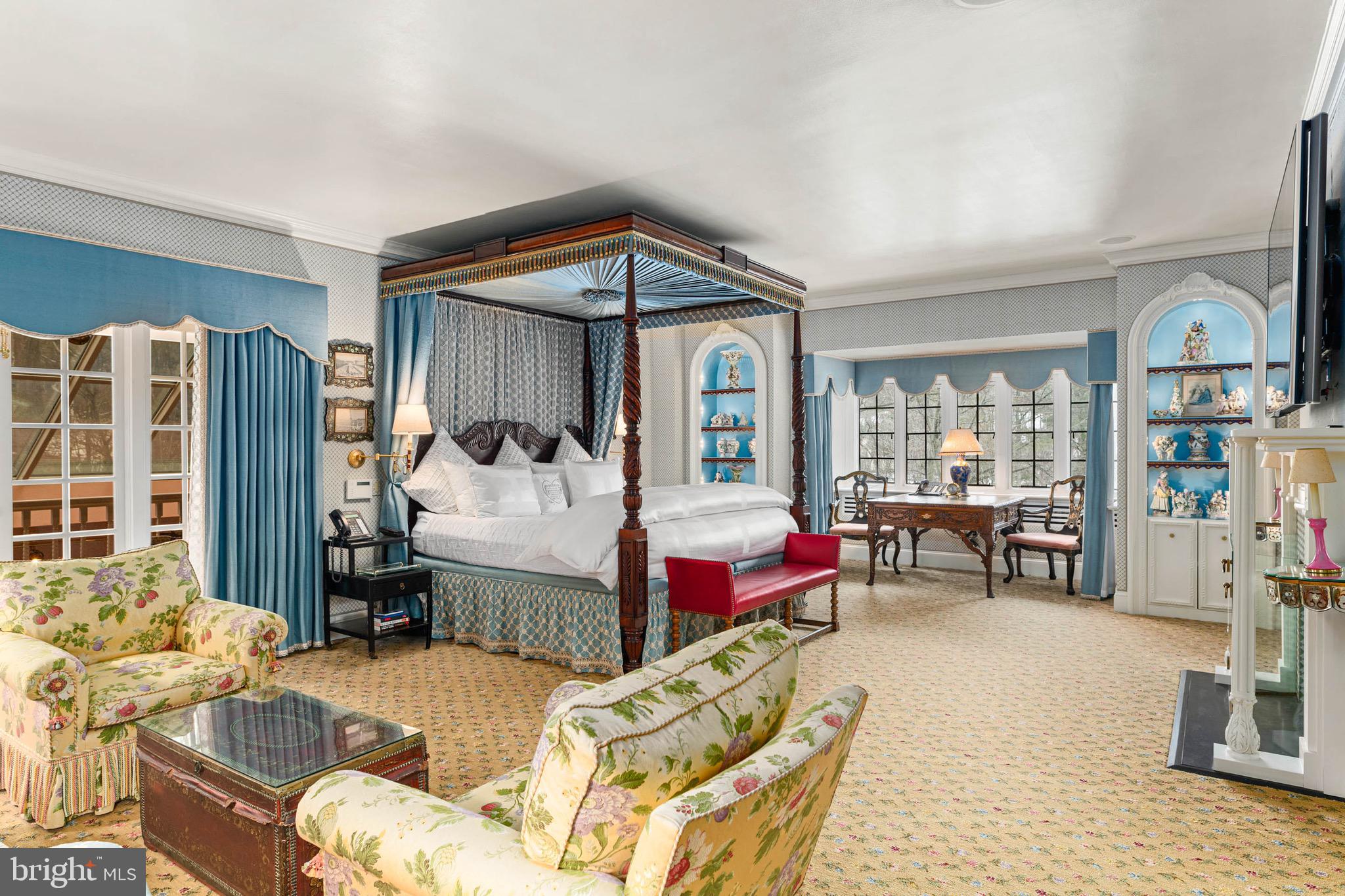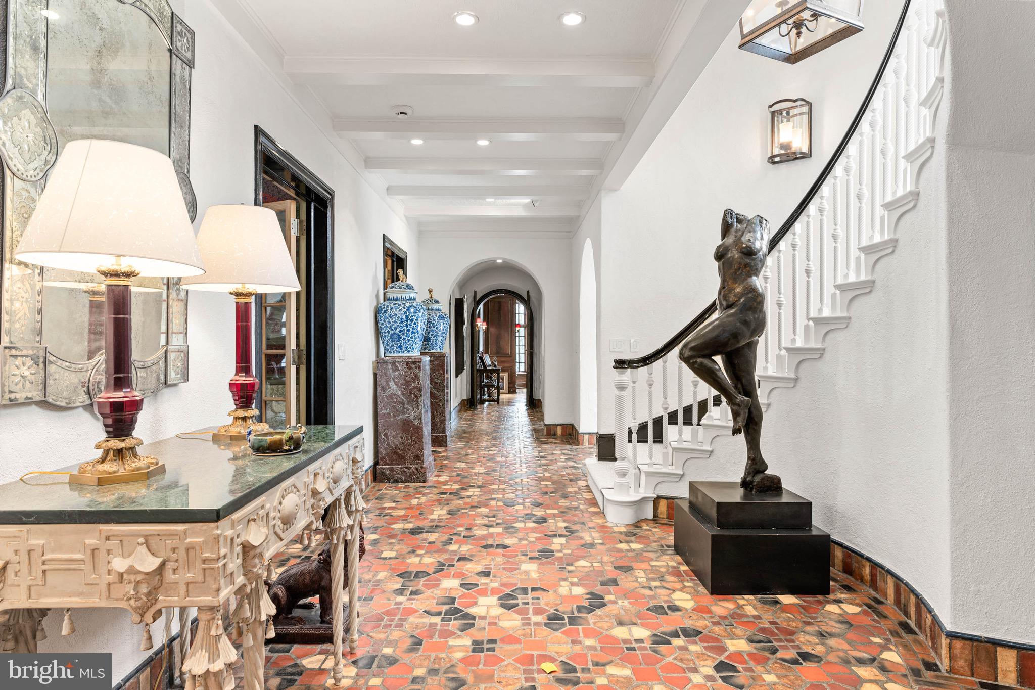 The interior unfolds through a Mercer-tiled reception hall and central stair gallery, where arched passages and long sightlines connect the principal rooms. Detailed millwork, decorative ironwork, refined ceiling treatments, numerous French doors, and seven gas fireplaces are found throughout. Large windows on every elevation bring natural light into the home and frame views of the surrounding grounds.