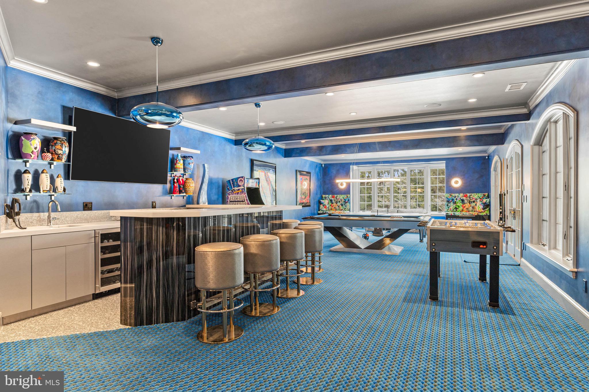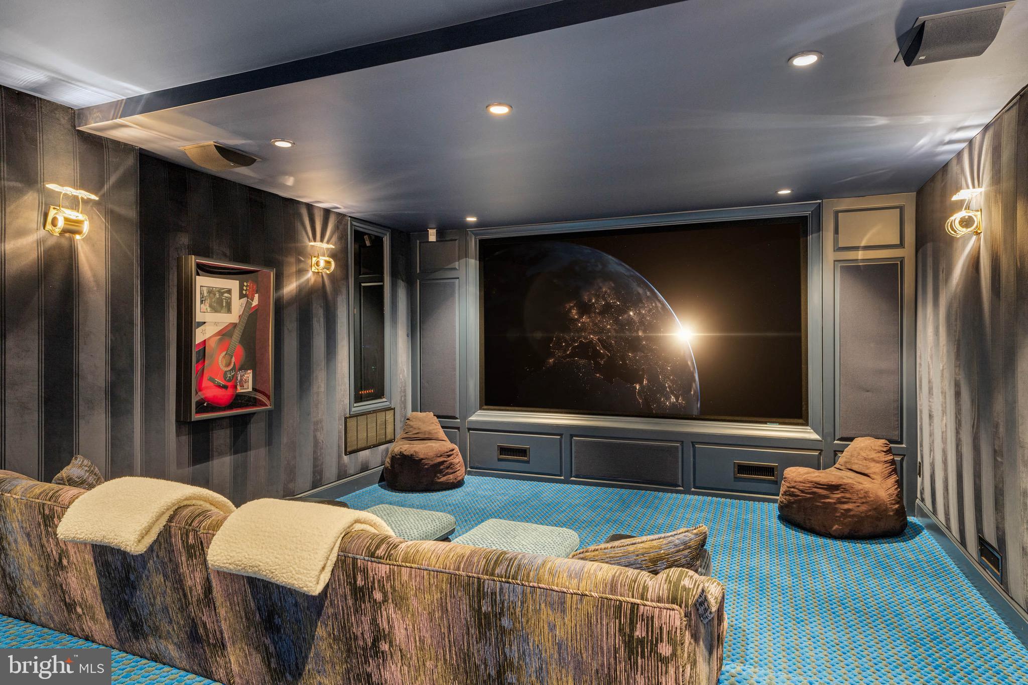 The daylight walk-out lower level is arranged for recreation and entertaining and features a custom bar, fitness room, theater with tiered seating, full bath, and direct access to the pool terrace and gardens.