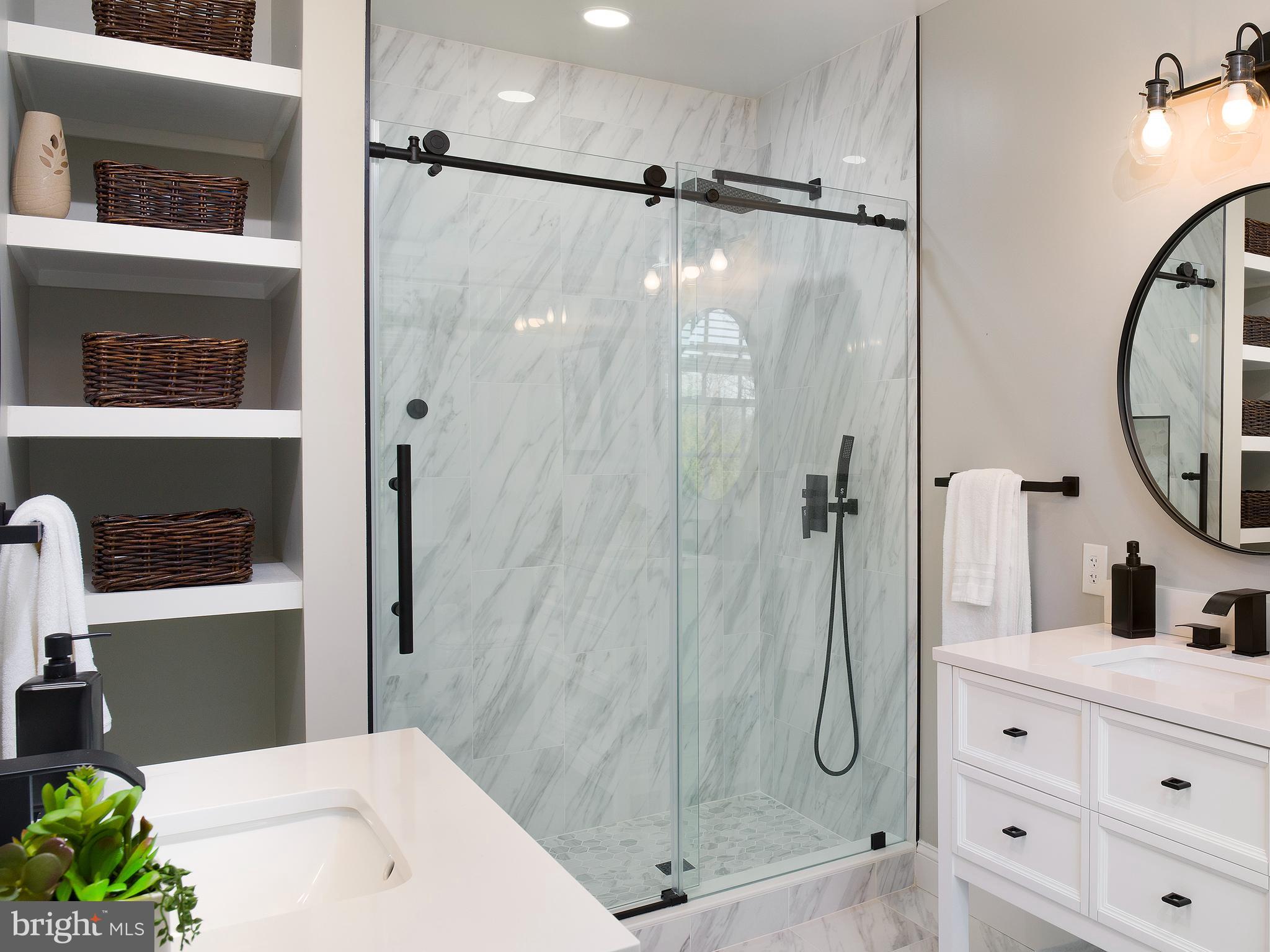 Ascend to the second floor, where you'll discover the luxurious primary suite, divided into two sections, providing a serene escape. Its two walk-in closets offer ample storage, while the adjoining primary bathroom was renovated to exude modern luxury with its glass-enclosed shower, new vanity, and tile flooring. Two additional bedrooms on this floor offer their own unique charm. One bedroom features two built-in bookcases and a built-in desk between, while the other exudes warmth with a wood-burning fireplace and brick surround.
