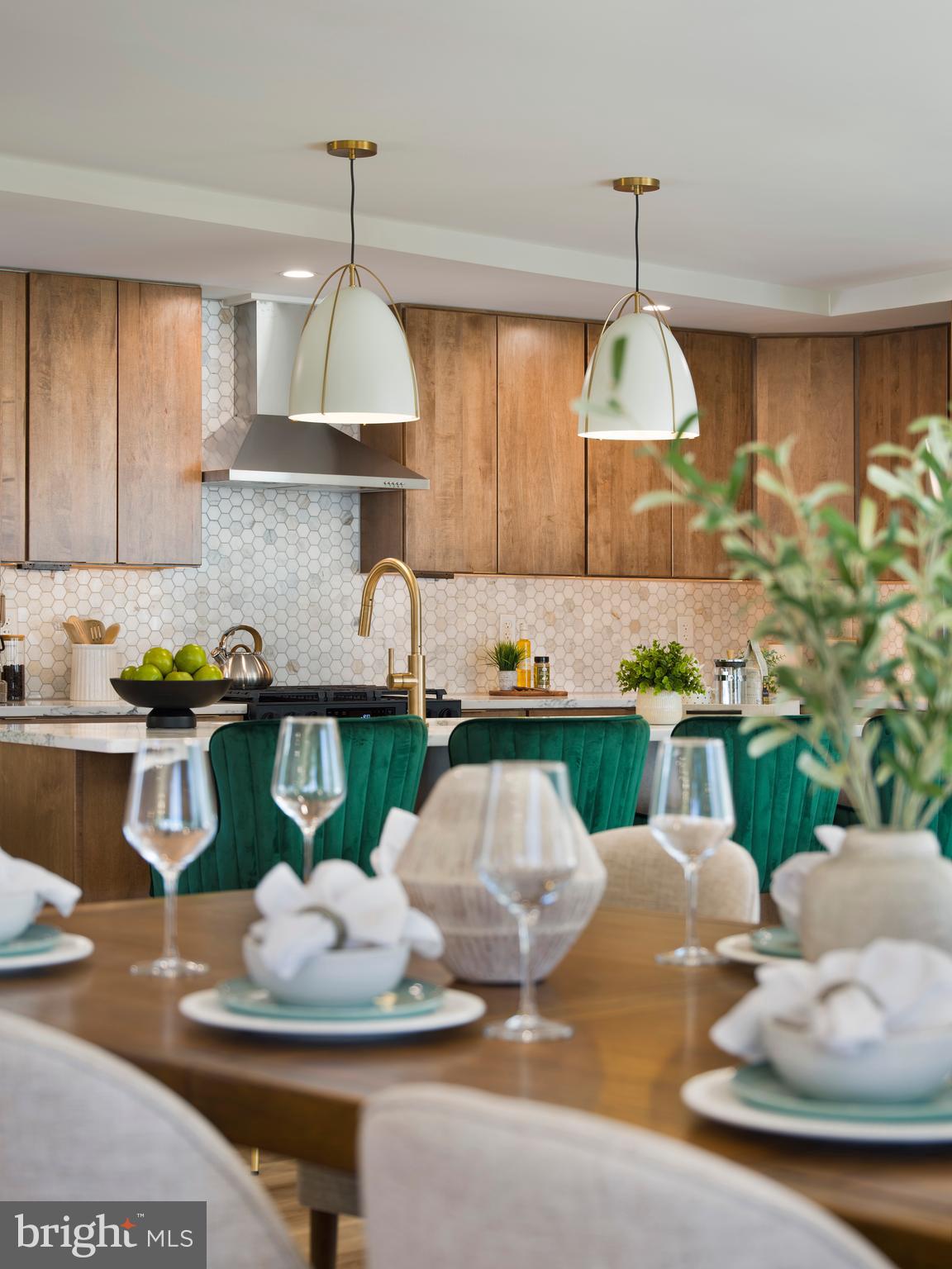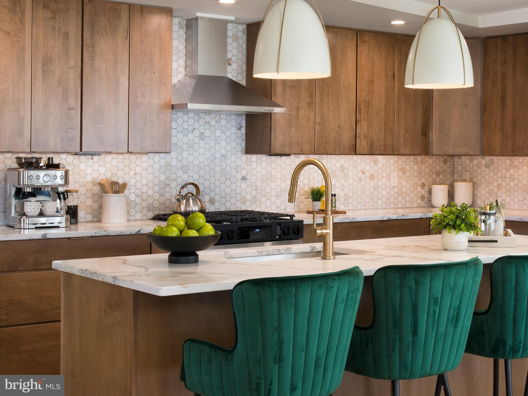 The main living level offers a seamless flow between the kitchen, dining area, and living room. The kitchen is designed with warm wood cabinetry, quartz countertops, stainless steel appliances, gas cooking, and a large center island with seating. Walls of windows bring natural light into the adjoining living spaces while overlooking the surrounding property.