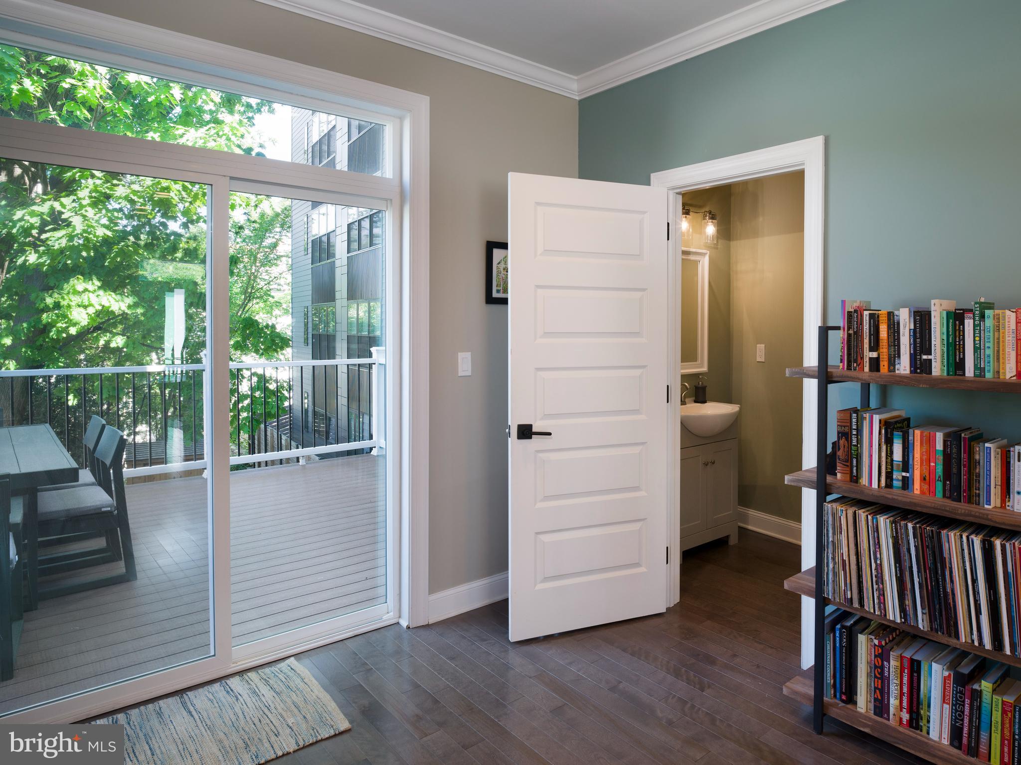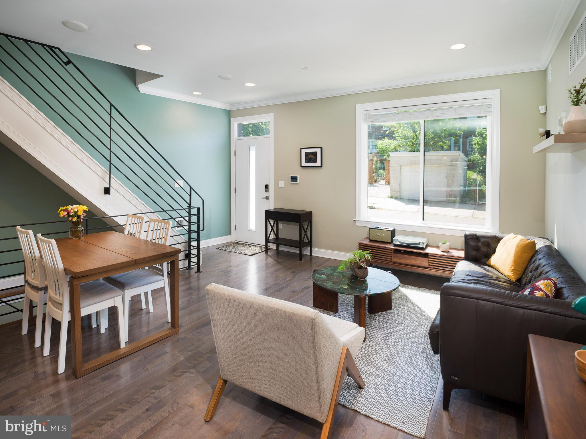 Step into the bright, open-concept living space where natural light pours in through oversized, wide-trimmed windows and a glass slider that frames lush greenery. Rich hardwood floors stretch throughout the main level, complemented by elegant crown molding, bullnose corners, and built-in speakers that blend form with function. Every detail has been thoughtfully curated--from the upgraded trim work to the sleek iron stair railing that leads you upstairs.