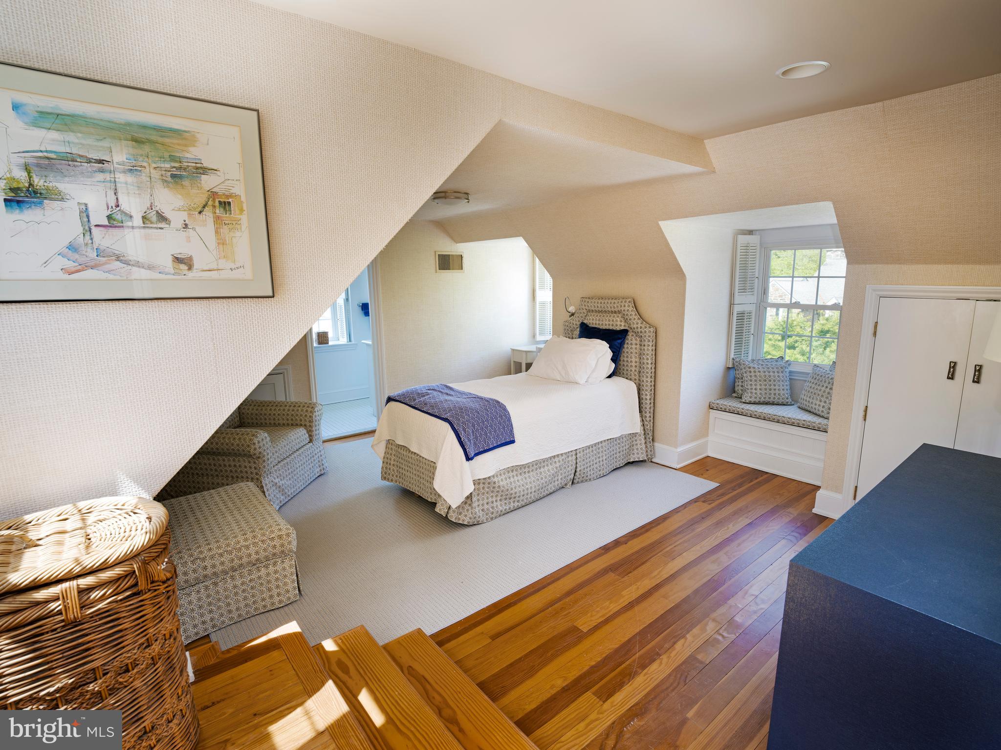 A vestibule entry opens to a traditional center-hall plan with hardwood floors throughout. The wood-paneled library, anchored by a fireplace and served by its own powder room, connects to a sunroom wrapped in stone and beadboard--a light-filled space that also opens to the living room and kitchen, establishing a natural flow across the main level. The living room, with a second fireplace and windows on multiple exposures, sits opposite a formal dining room, where a deep bay window frames views of the front grounds and mature specimen trees.