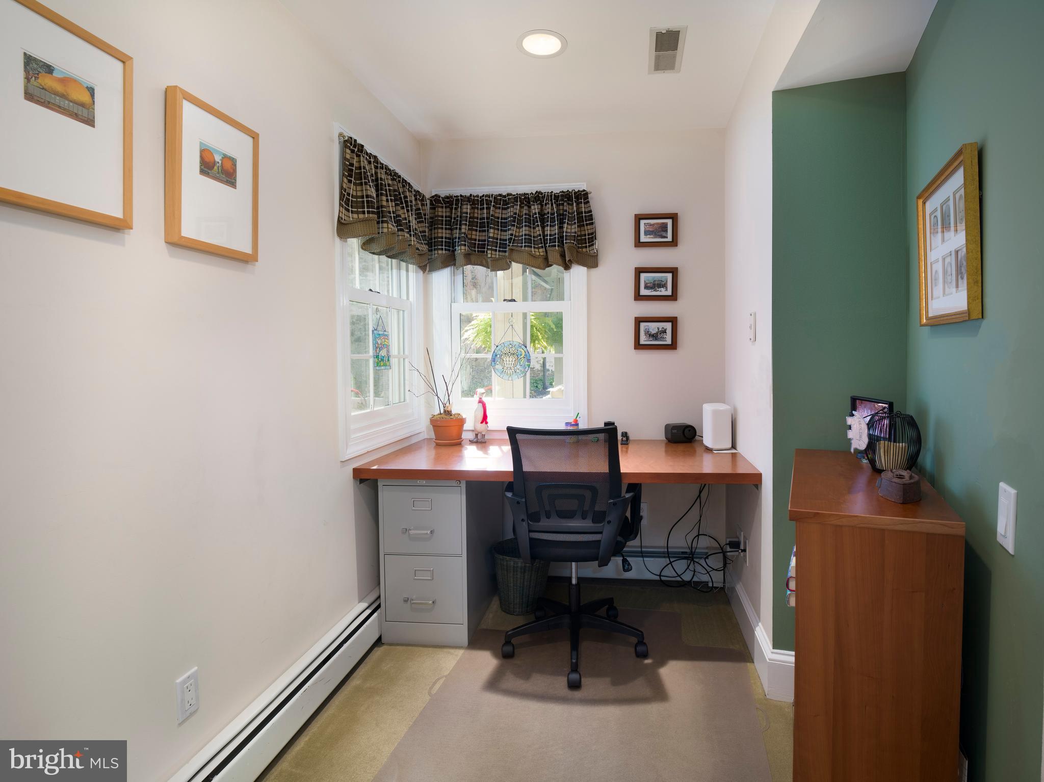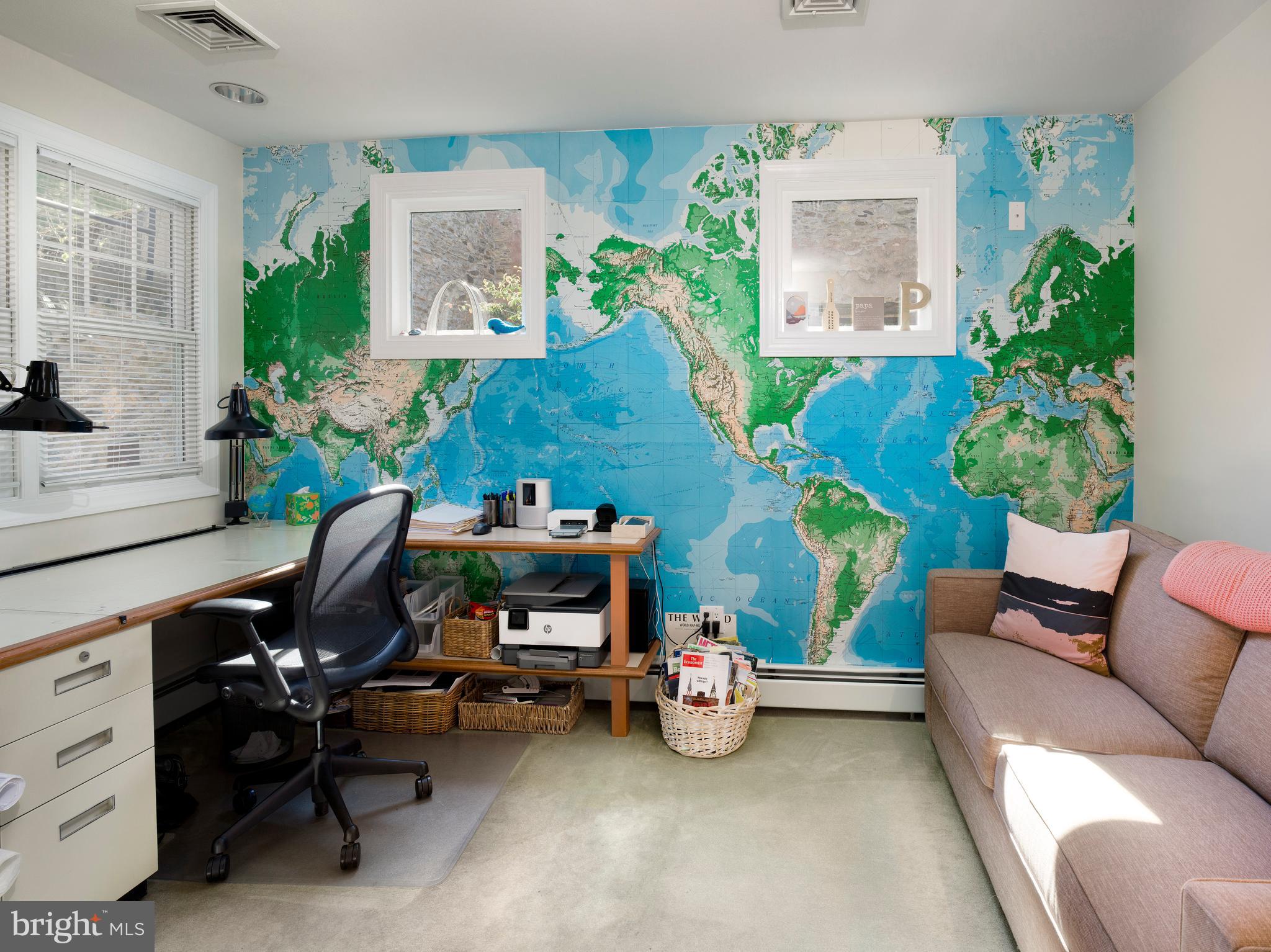 Inside, the home is a masterful blend of open-concept spaces and cozy Cape Cod-style rooms. Whether it's a family gathering in the dining room, a quiet moment by the fireplace, or working in the dedicated office space, (which is the 4th bedroom, there is a closet), this home offers a flexible layout designed for living, working, and playing. The garden-level living space features 25-foot ceilings, a playroom, and a half bath, while the main floor is home to an office, a full bath, and a well-appointed kitchen with granite countertops, ample cabinetry, and a large island with an eat-in area.